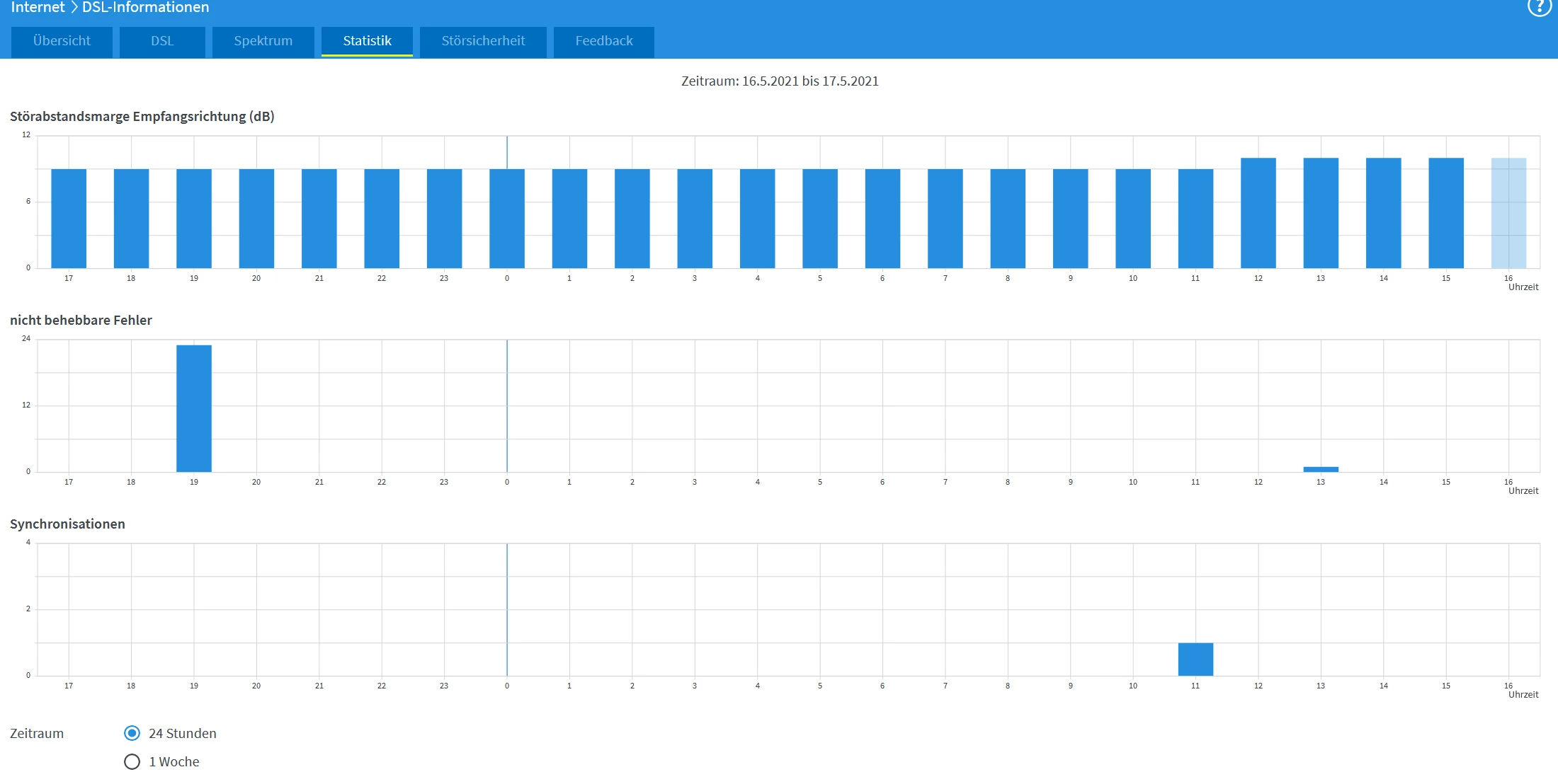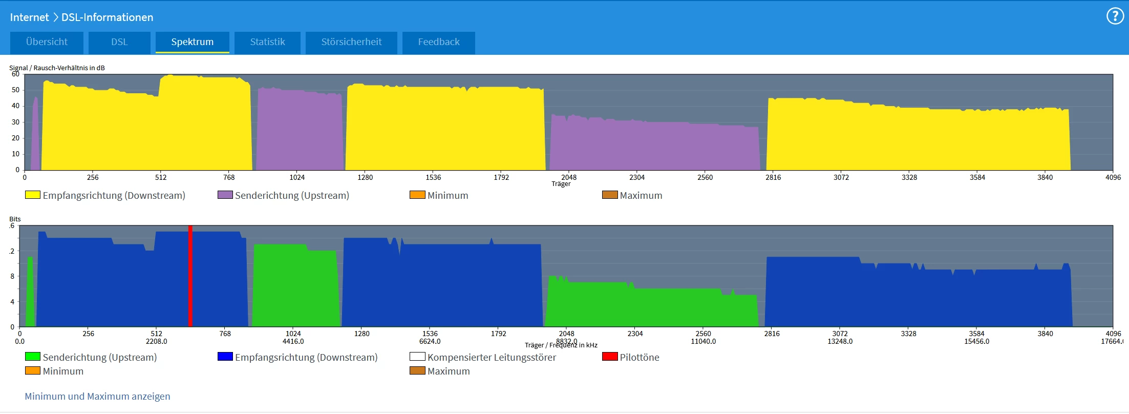 Im Zuge des upgrades (schon davor) deutete mein Spektrum darauf hin, dass ein Fallback-Profil bei mir dauerhaft greifen würde (ich plappere aus Foren nach und habe selbst keine Ahnung). Ich meldete eine Störung. Der Telekom-Techniker Techniker konnte sich das dauerhafte Verhalten nicht erklären. Er verlegte meinen Anschluss “auf eine komplett andere Baugruppe”. Seither habe ich konstant diese Werte und dieses Verhalten.