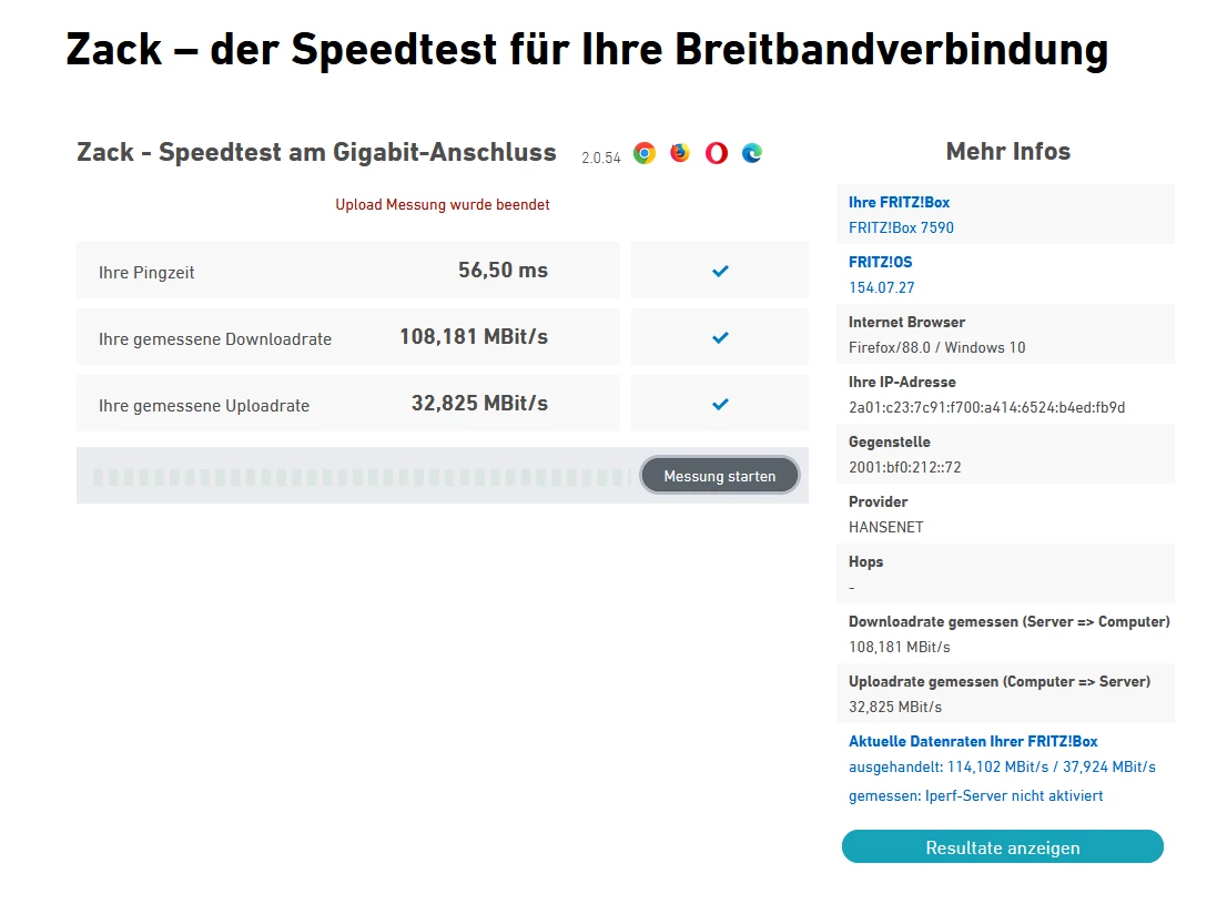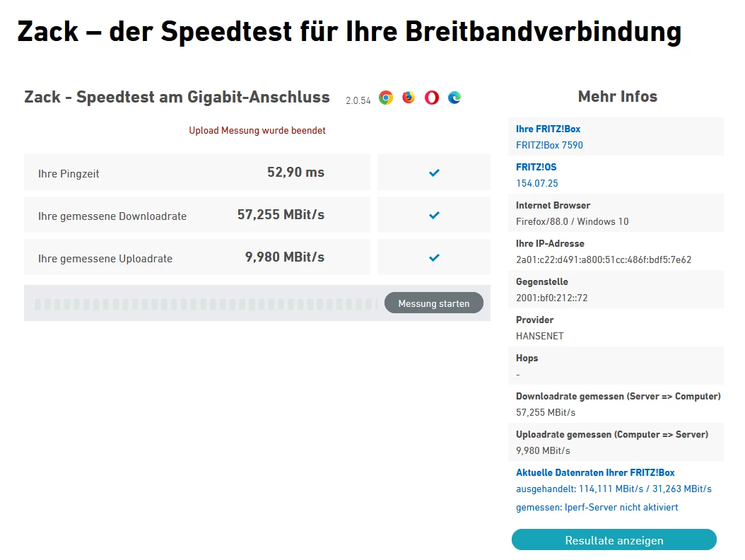 Hab ich gemacht - hat leider keine Verbesserung gebracht. Weder im Upload noch im Download. Ist gleich oder schlechter. Beim Zack-Test über AVM sieht das so aus.