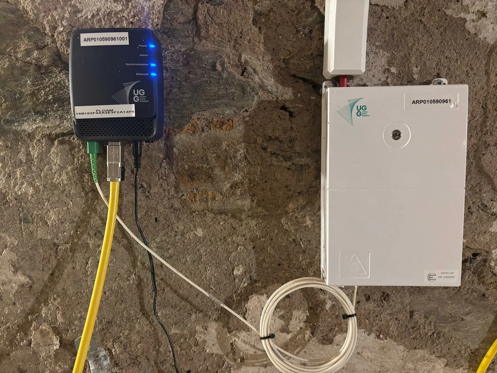 Leider ist hier keine Glasfaser-Dose vorhanden, die die Schnittstelle zwischen Kunde und Infrastrukturbetreiber definiert, aber das ist eben der übliche Aufbau bei diesem Infrastrukturbetreiber. Hier ist die Schnittstelle den RJ-45 Port am ONT.