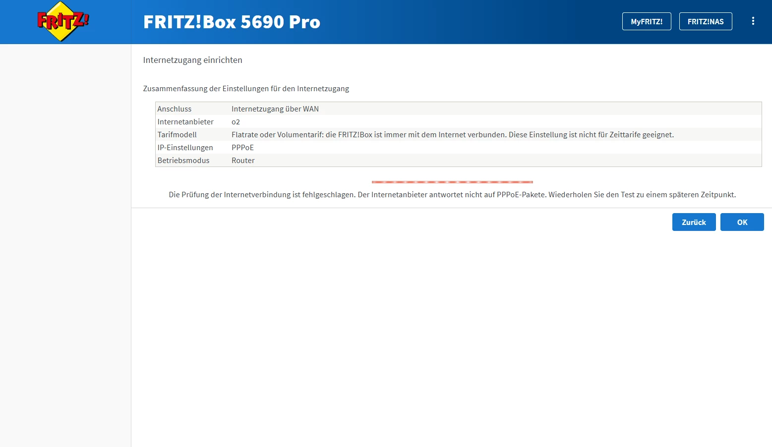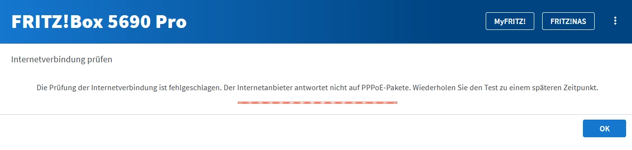 Problem kurz zusammengefasst: logge mich auf der fritzbox seite ein ins Konfigurationsmenü, mache alles Schritt für Schritt, (durfte sogar bei AVM anrufen um einen Link für das Manuelle Update zu bekommen, was ich schon mal sehr schwach von o2 fand, aber egal, Problem wurde damit nicht behoben), und bekomme am Ende die Fehlermeldung “Die Prüfung der Internetverbindung ist fehlgeschlagen. Der Internetanbieter antwortet nicht auf PPPoE-Pakete. Wiederholen Sie den Test zu einem späteren Zeitpunkt”