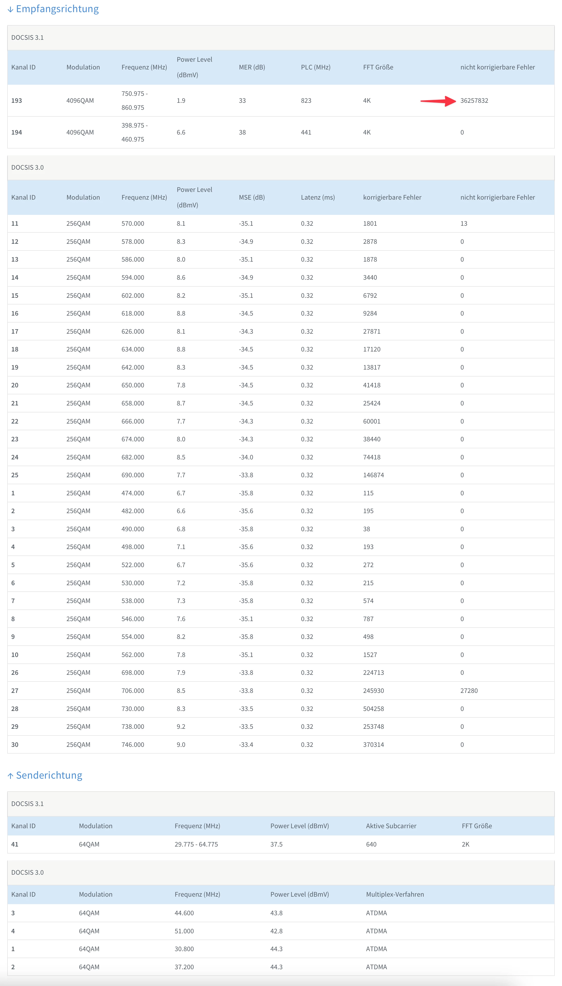 Für mich auffällig ist, dass der Router eine exorbitant hohe Anzahl an nicht korrigierbaren Fehlern auf dem DOCSIS 3.1-Kanal 193 ausweist.