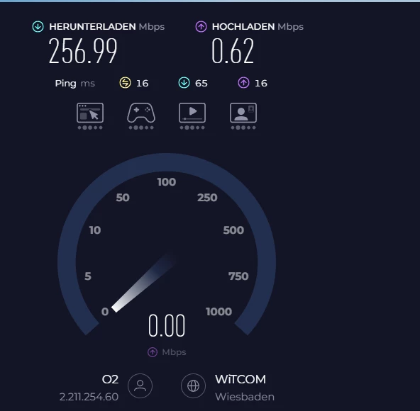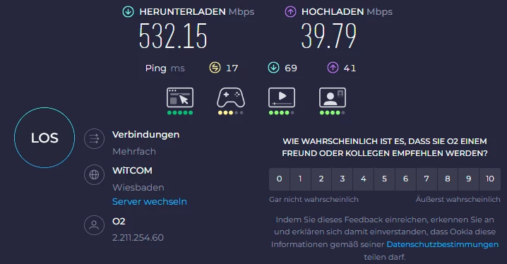 Gebucht ist O2 Home XL mit 500M/bits im Download und 50Mbits im Upload. Realtisch sind es allerdings nur knapp 900kbits im Upload. Der Donwload schwankt zwischen 50- und 550Mbits.