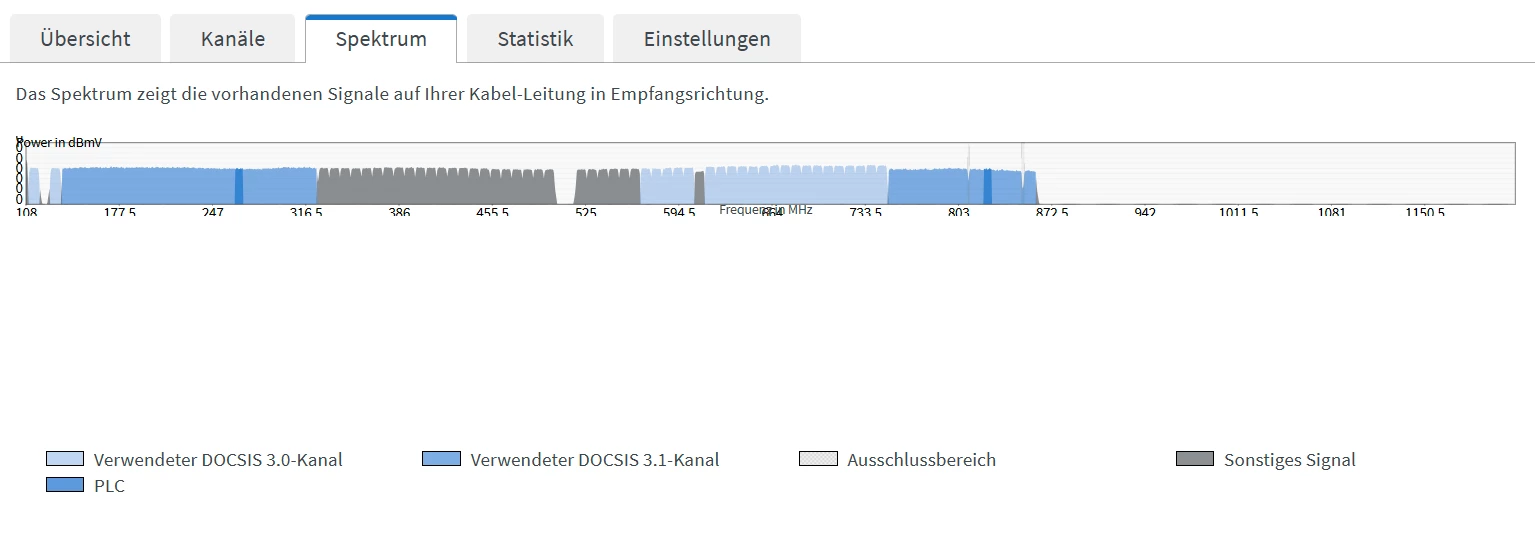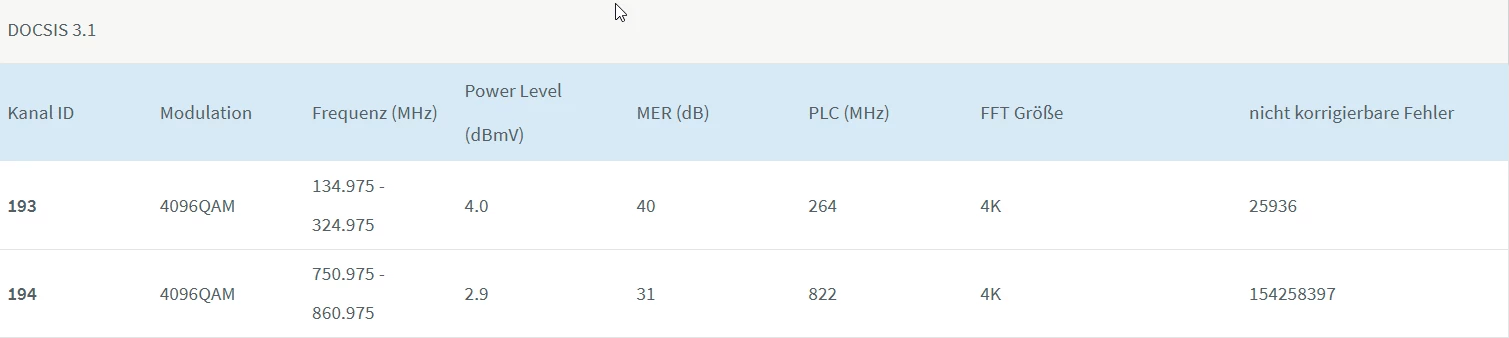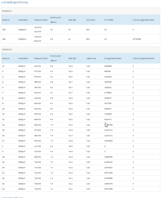 Dass Soll in Empfangsrichtung ist 4096QAM, für Docsis 3.1 (D3.1) und 256QAM für Docsis 3.0 (D3.0)).