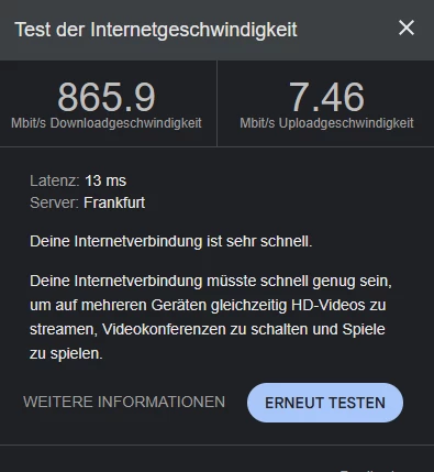 Dann den grünen "Test starten" Button klicken und 3 Minuten abwarten (und zu keinem anderen Browsertab wechseln), danach bitte einen Screenshot der Resultatbox machen und posten.