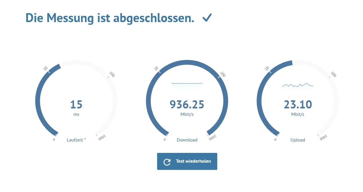 Der Download ist circa bei 960 Mbit/s. Der Upload ist momentan bei 6Mbit/s, war aber vor einem Monat immer bei 42 Mbit/s.
