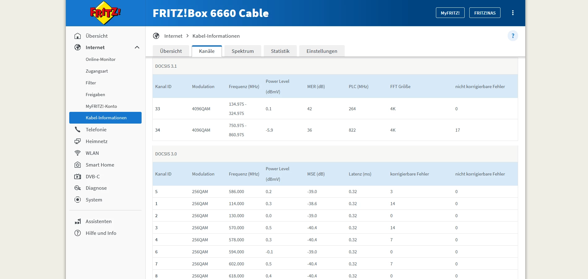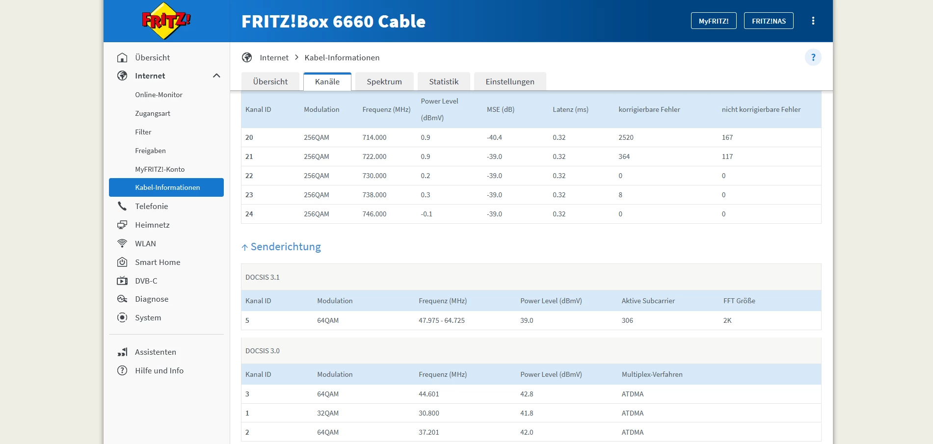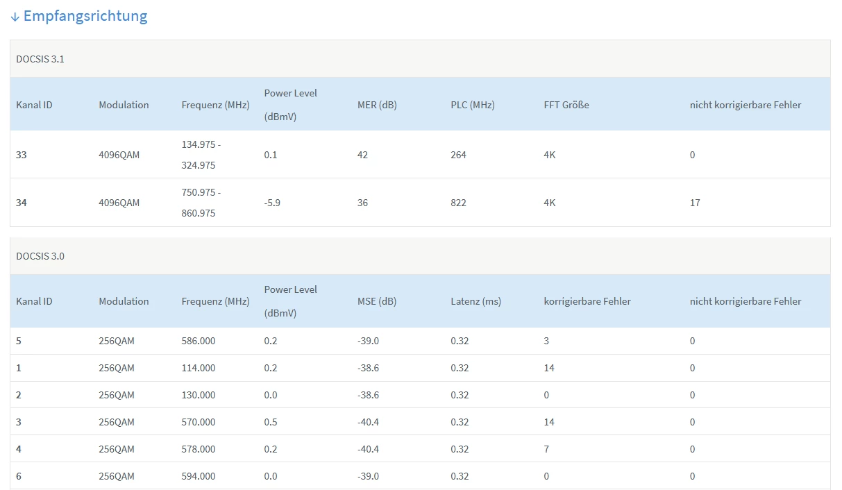 Der DOCSIS 3.1 Kanal sollte eigentlich 4096QAM verwenden statt 64 QAM, also 12 Bit pro Symbol, statt 6, und die Docsis 3.0 Sendekanaele sollten eigentlich auch alle bei 64QAM liegen (aber 32QAM ist die naechst niedrigere Stufe, das kann schon mal vorkommen).