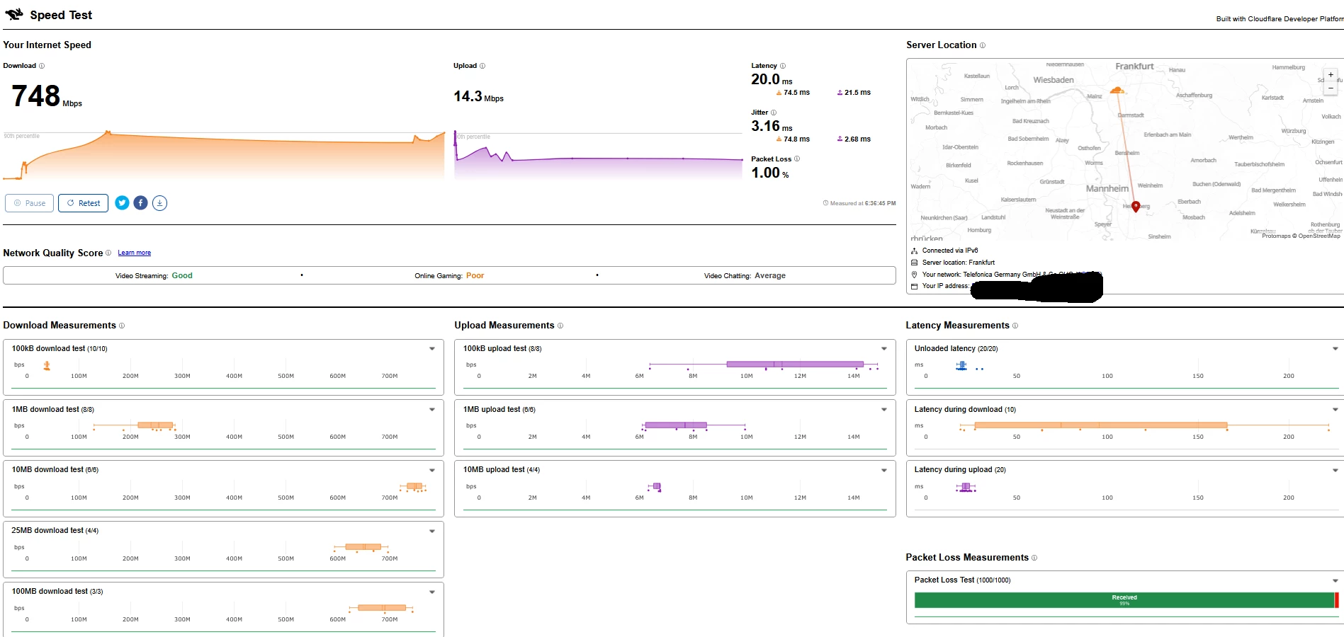 Danke, wie erwartet zeigen beide die Uploadprobleme und der Cloudflaretest auch den Paketverlust...