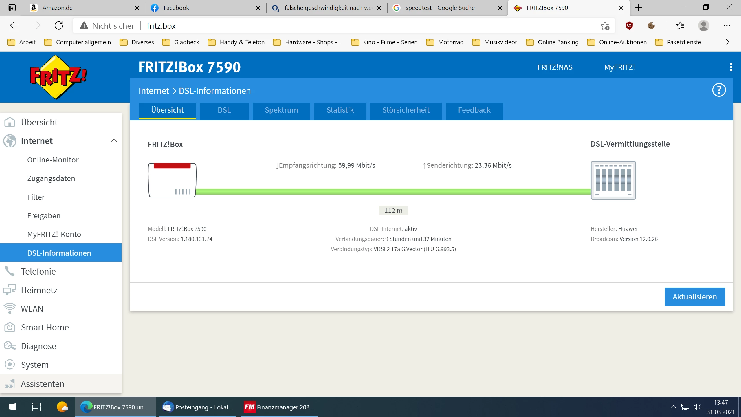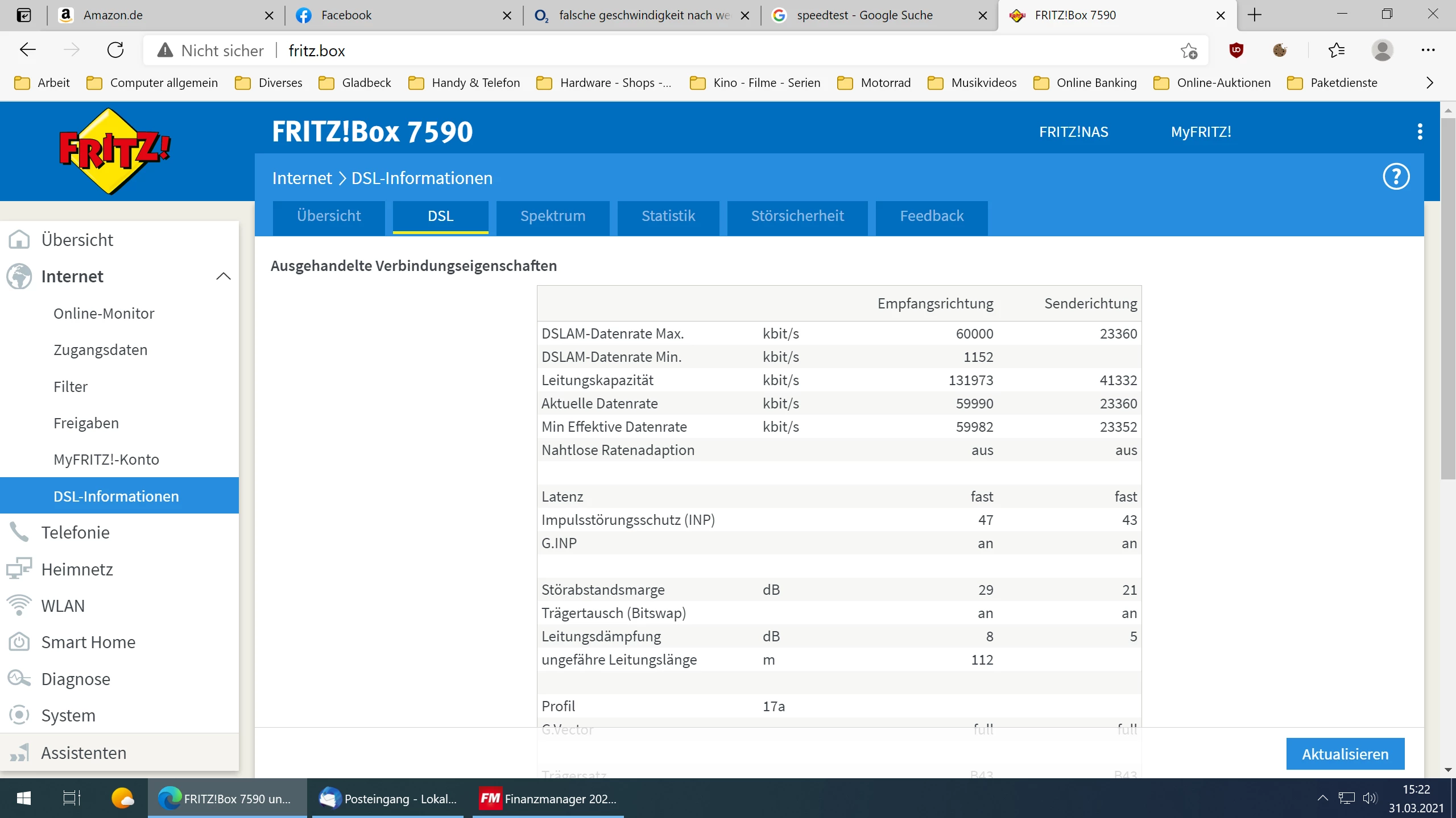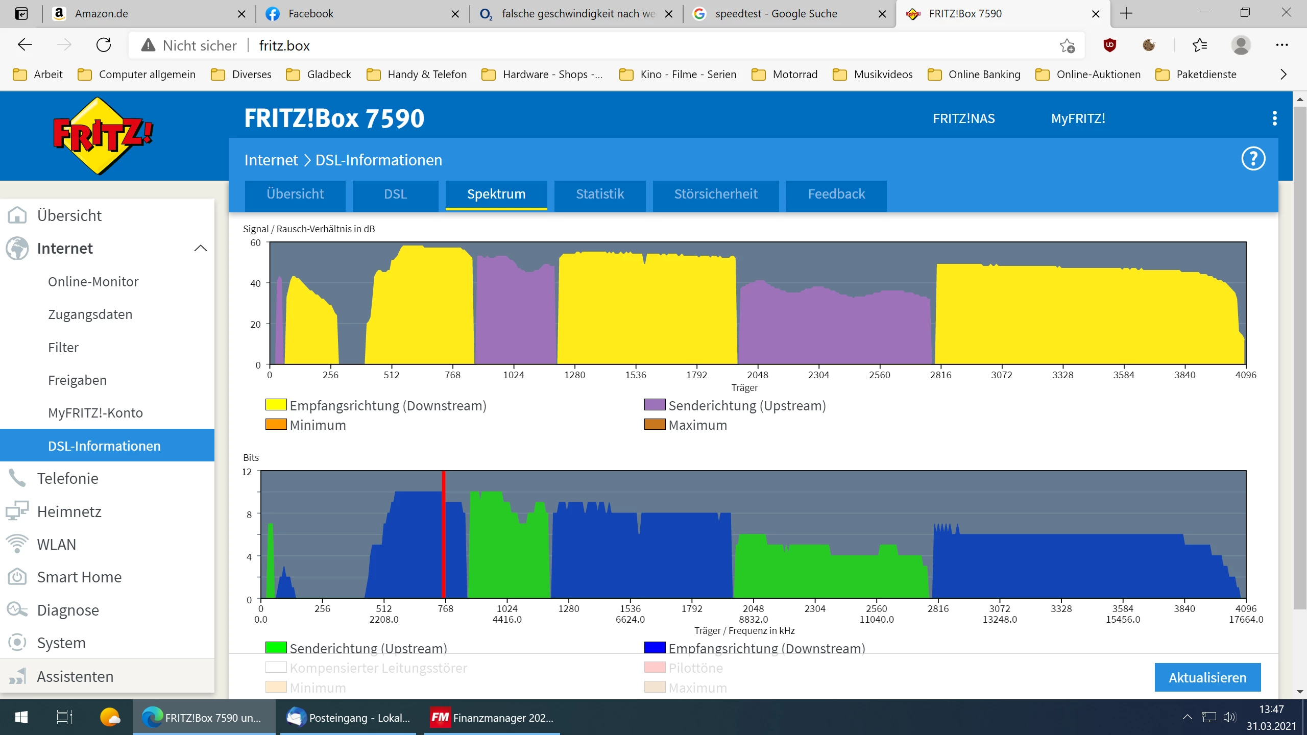 Dann poste bitte Screenshots von aus der FRITZ!Box von: DSL → DSL-Informationen → DSL, Spektrum und Übersicht. Außerdem überprüfe bitte System → Ereignisse → Internetverbindung auf Meldungen zu unzulässiger Verkabelung sowie Störungen zu Powerline