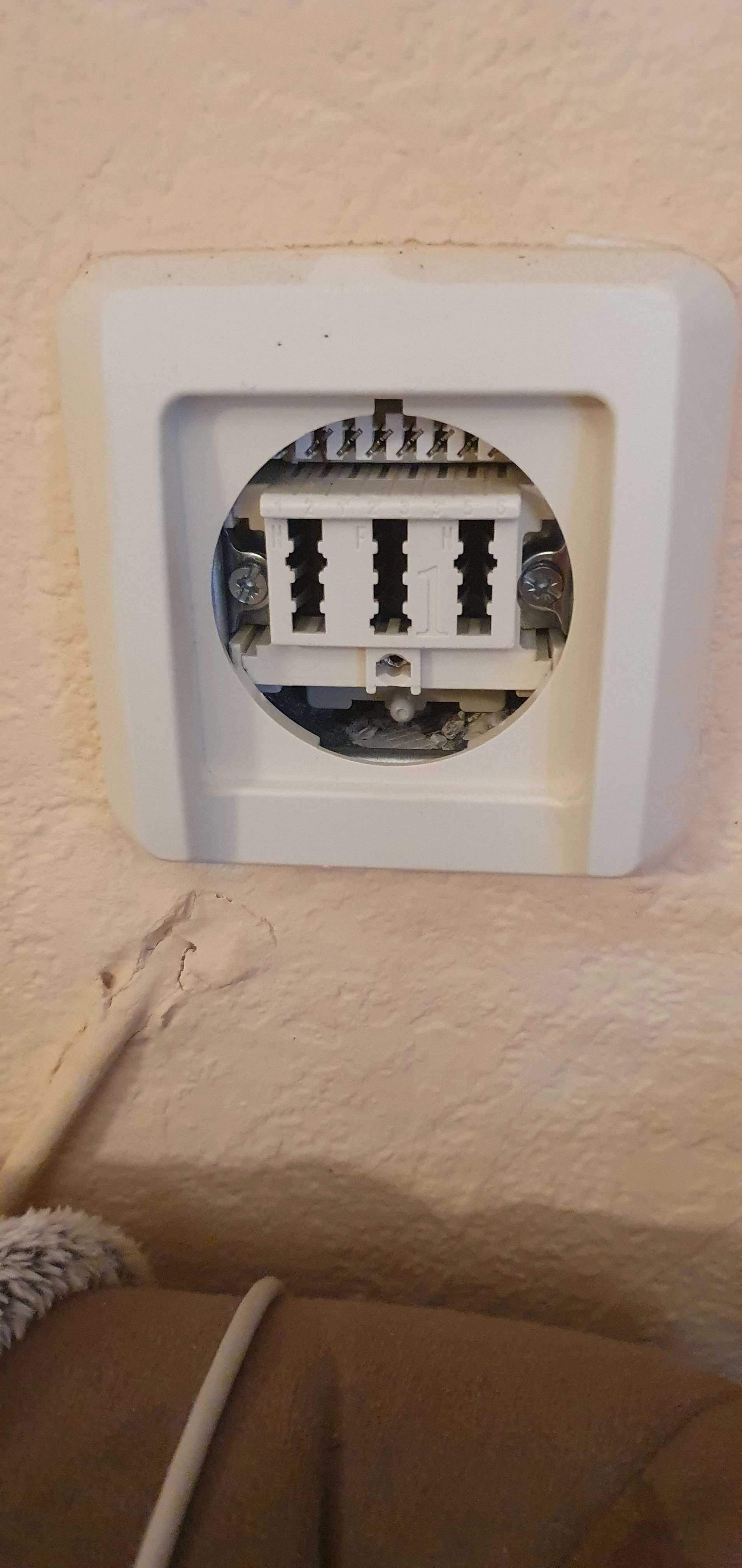 Foto Dose im Wohnzimmer. Die Leitung wurde von der Dose im Flur von einem Telekom Techniker (!!) ins Wohnzimmer verlegt, auf der letzten Meile oder wie das heißt dürfen nur die Telekomer dran sagte man mir und o2 hat das damals veranlasst das der zu mir kommt und das macht.
