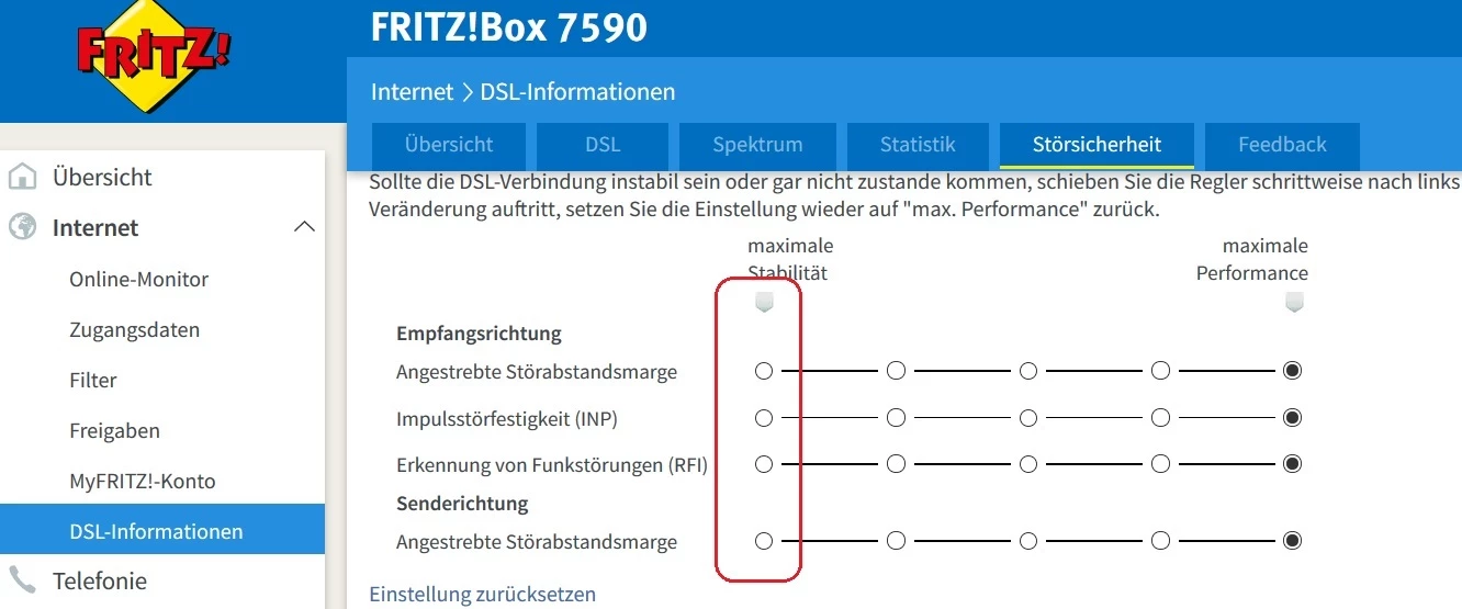 So nun mache bitte folgendes. Fritzbox anschließen, sobald Sie hoch gefahren ist sich in diese einloggen und mit der Störsicheit spielen. Erstmal alles auf maimale Stabilität.