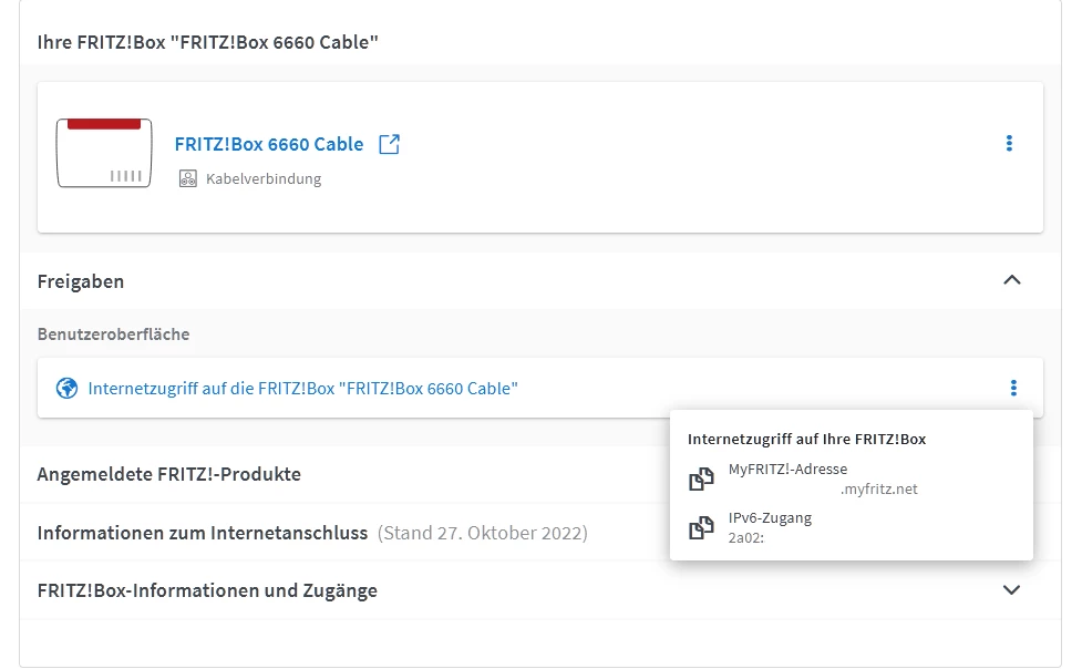 Was leider nicht funktioniert, ist der Zugang von außen via MyFritz auf die Fritzbox. Weder über IPv4 noch IPv6. Auf der Fritzbox-Oberfläche sehe ich zwar meine externe IPv6-Adresse aber der Zugriff klappt nicht.