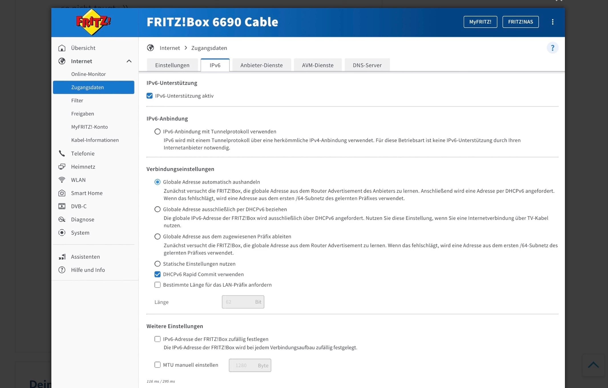 @loerzi Reiter bei IPv6 so eingestellt? Welchen Status hat deine Fritzbox bei AVM unter myFritz?