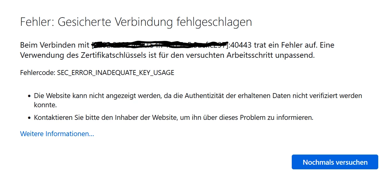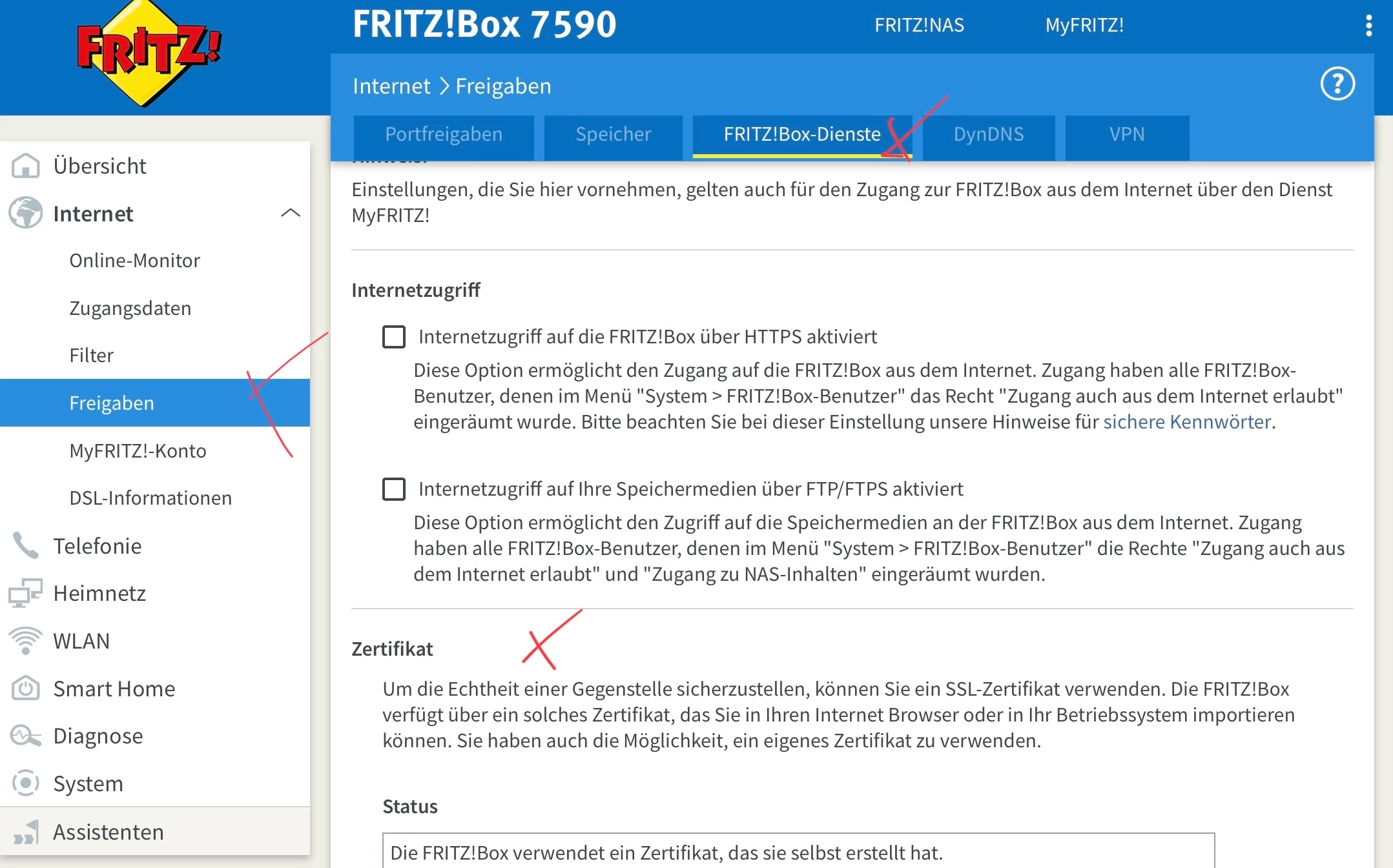 @Joe DoeVielen Dank für deinen Support. Ich benutze Windows 11 und Firefox. Nach dem Importieren des Zertifikats in den Firefox komme ich auf die Startseite der Fritzbox. Super. Jetzt würde ich aber eigentlich noch gerne auf meine Nextcloud, die auf einem Raspi installiert ist und die ich per DynDNS zugänglich machen möchte. Das funktioniert aktuell nicht, weil wenn ich die beim DynDNS Anbieter hinterlegte Adresse angebe, lande ich auch auf der Startseite der Fritzbox und nicht auf der Startseite der Westcloud.