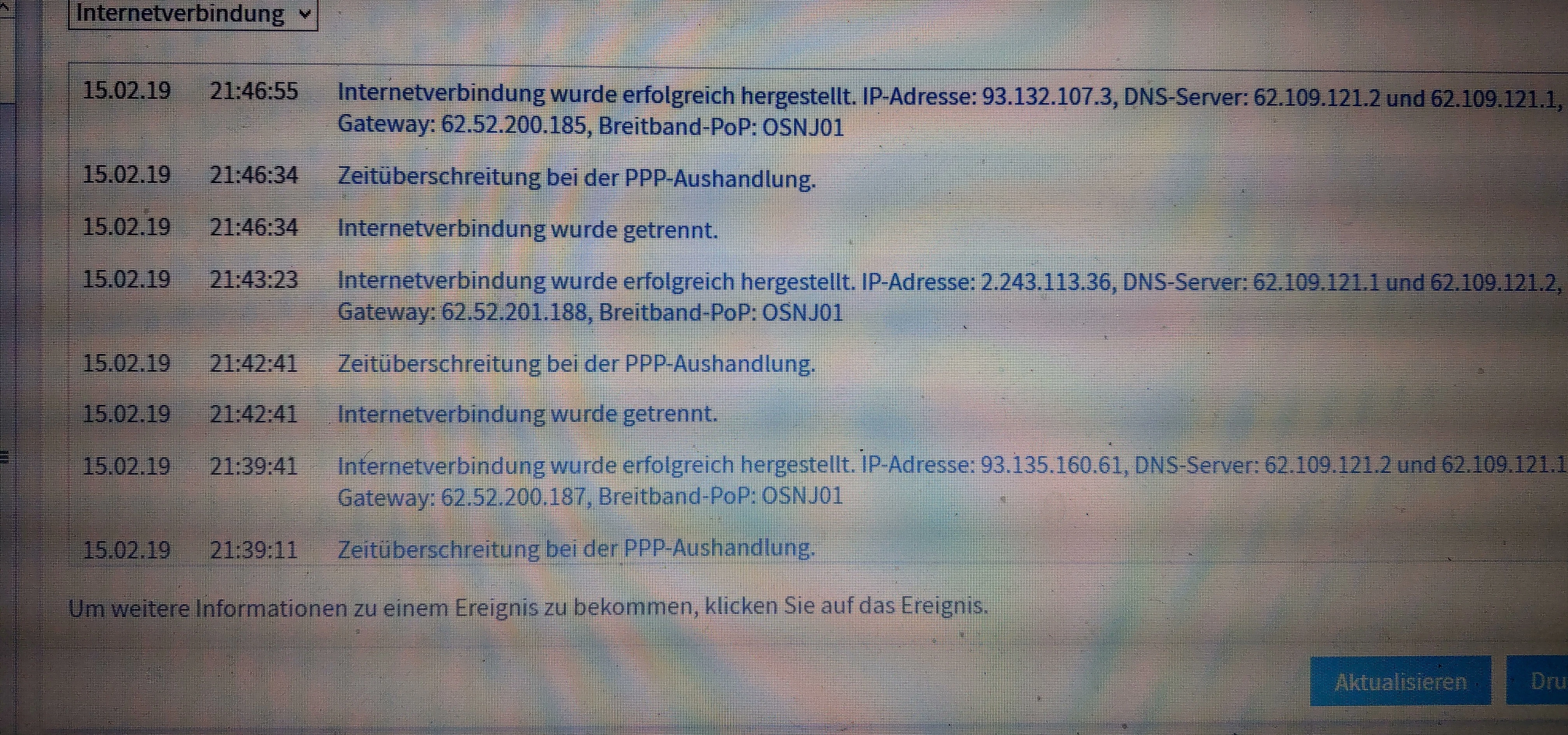 Mit der Fritzbox passiert nicht (LED leuchten), DSL Verbindung ist stabil. Router macht kein Reboot oder etwas. ROUTER und alle Kabels sind original und in ORDNUNG! Wenn Sie meinen, das Problem ist mit der Router, schicken Sie mir bitte einer Original o2 zu testen, oder einfach freischalten Sie mir o2 Box, welchen habe ich bekommen. Ich kaufe neuer Router nicht, habe ich das schon probiert. Wenn Sie es nicht beheben können, ich möchte Kundigen. Dass ich nicht normal, dass man fast ein Monat für das Internet warten muss.