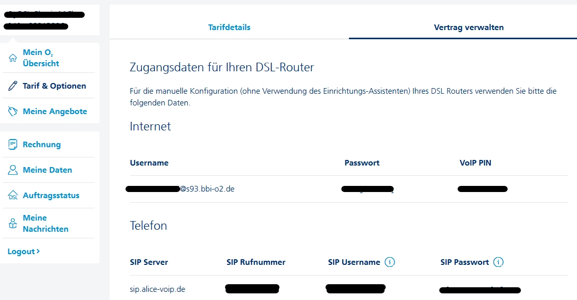 Die Telefoniedaten findest du normalerweise im “Mein-o2”  unter  > Tarif u Optionen > Vertrag verwalten  > Zugangsdaten ….. < .