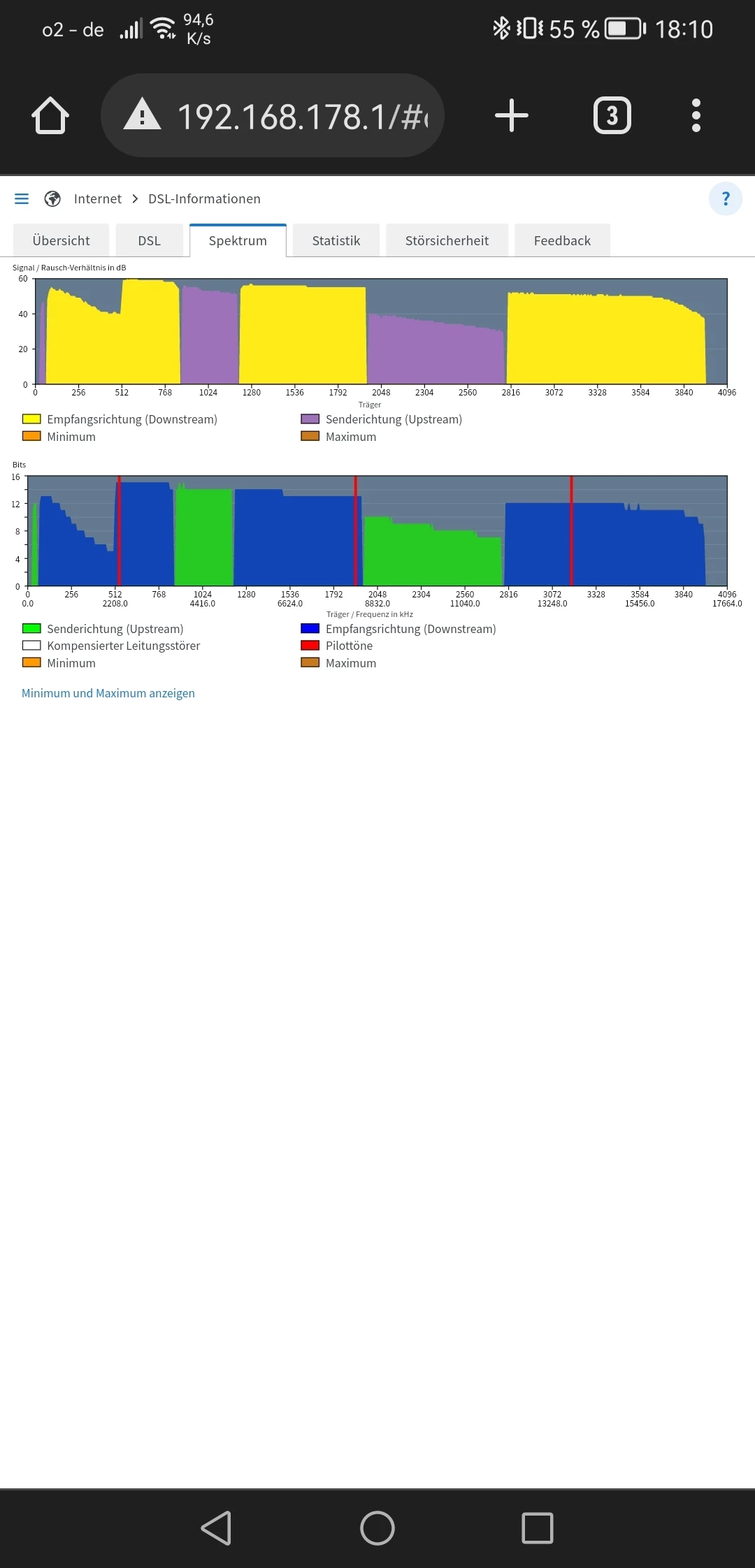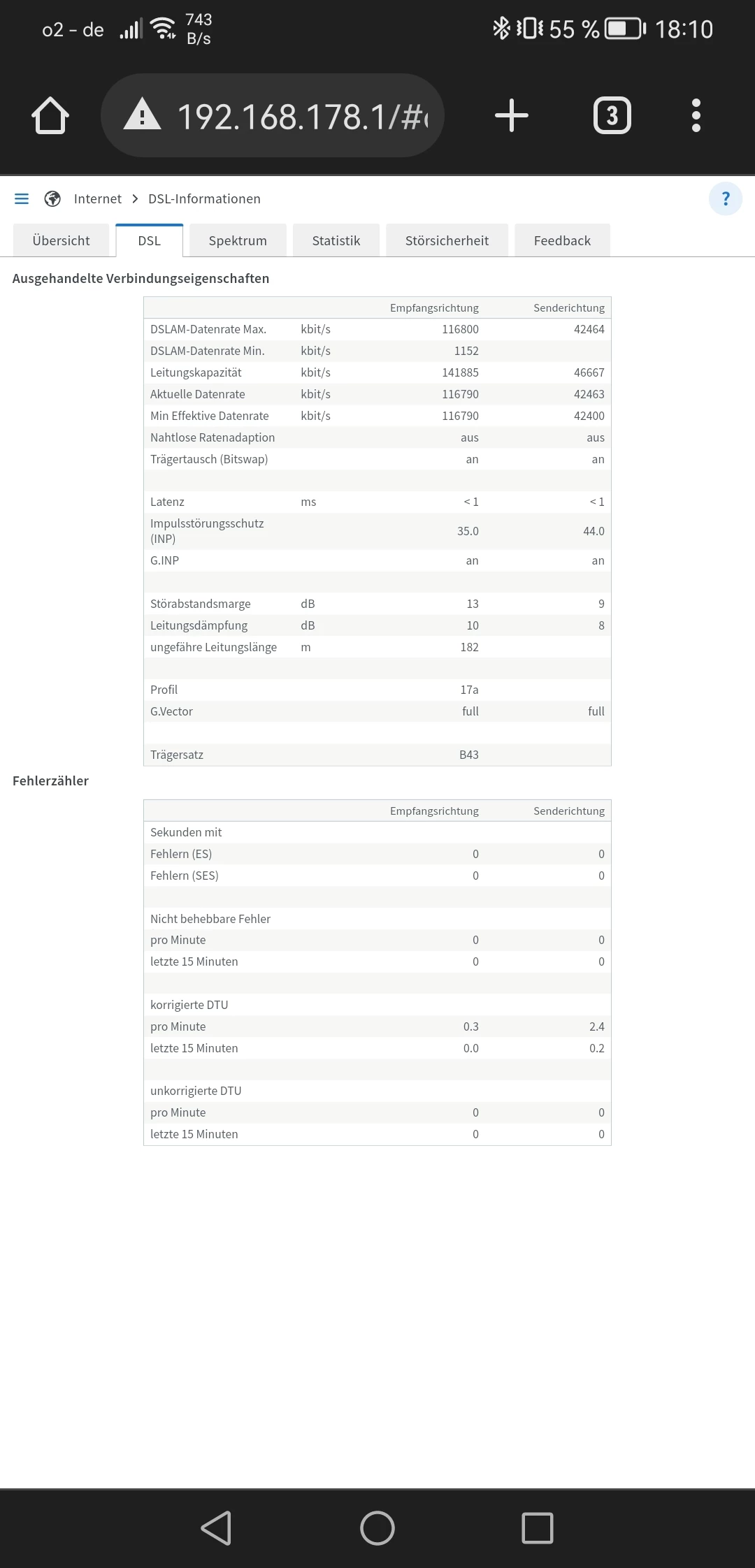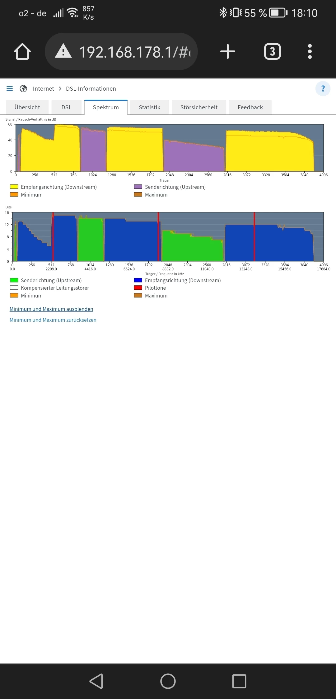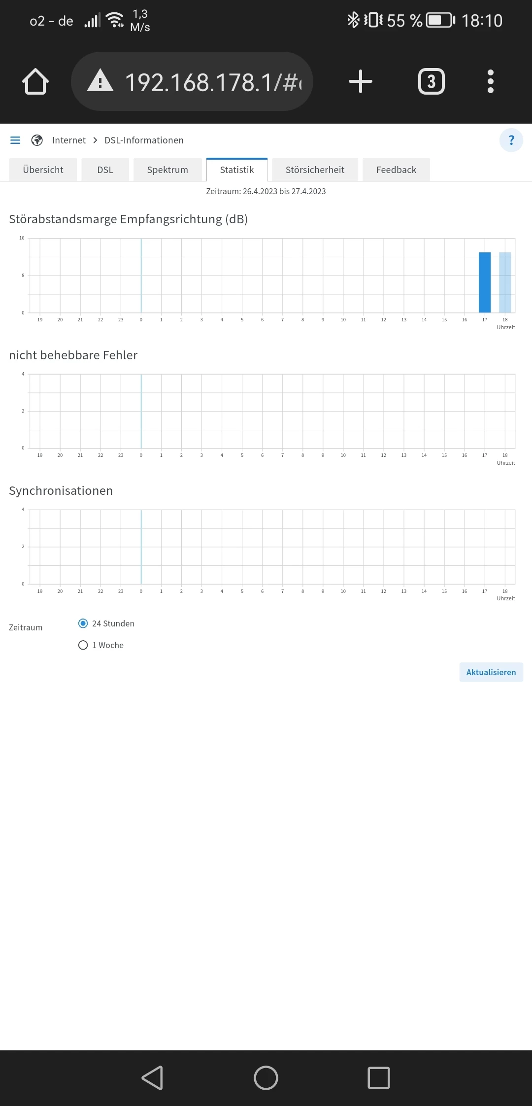 • Bildschirmfoto von Übersicht, DSL alle Werte, Spektrum, Statistik (Woche)