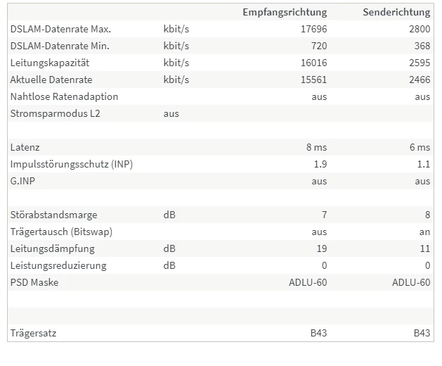 der DSLAM könnte 17696 die Leitung 16016, der DSLAM und das Modem haben sich auf 15561 geeinigt.