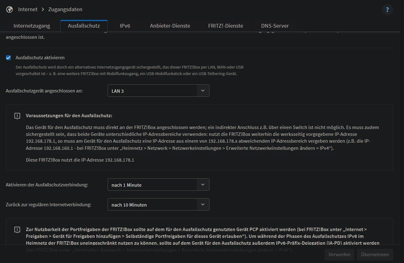 Unten auf 1 Minute / 10 Minuten stellen. Nie auf “sofort”. Sonst orgelst du beim 24 Stunden Reconnect erst einmal auf der Ersatzverbindung herum. Habe da den allerersten o2 Homespot 5G (ja das runde Ei) dran und es läuft wie ein Uhrwerk. 😉