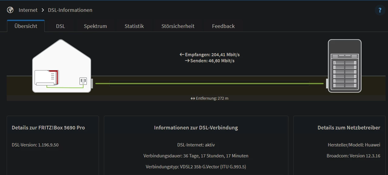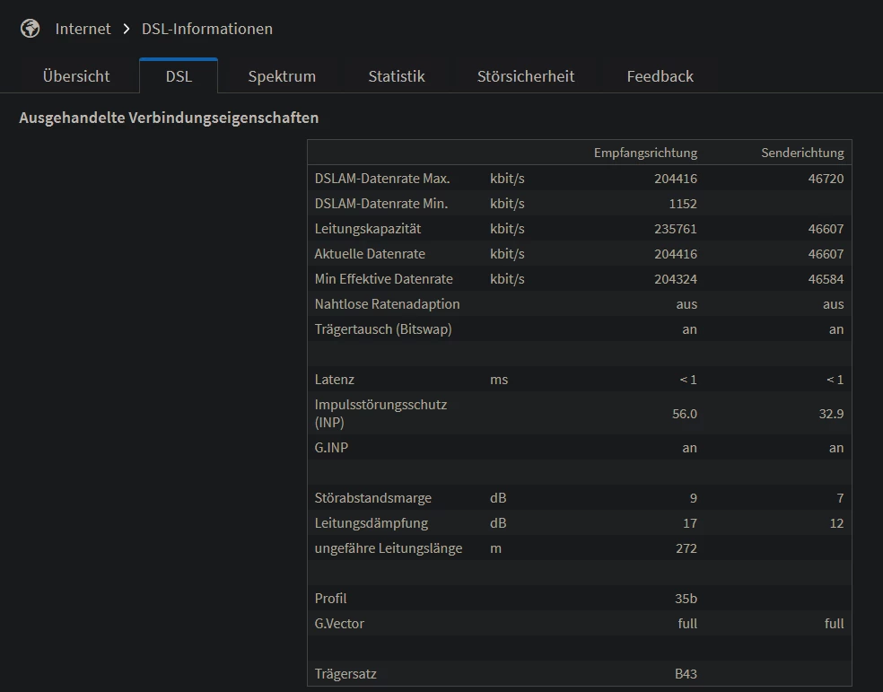 Konstant 204 mbit auf der Leitung bei DSL 175 (250 er nicht verfügbar weil Leitungskapazität nur immer zwischen 232 und 237)