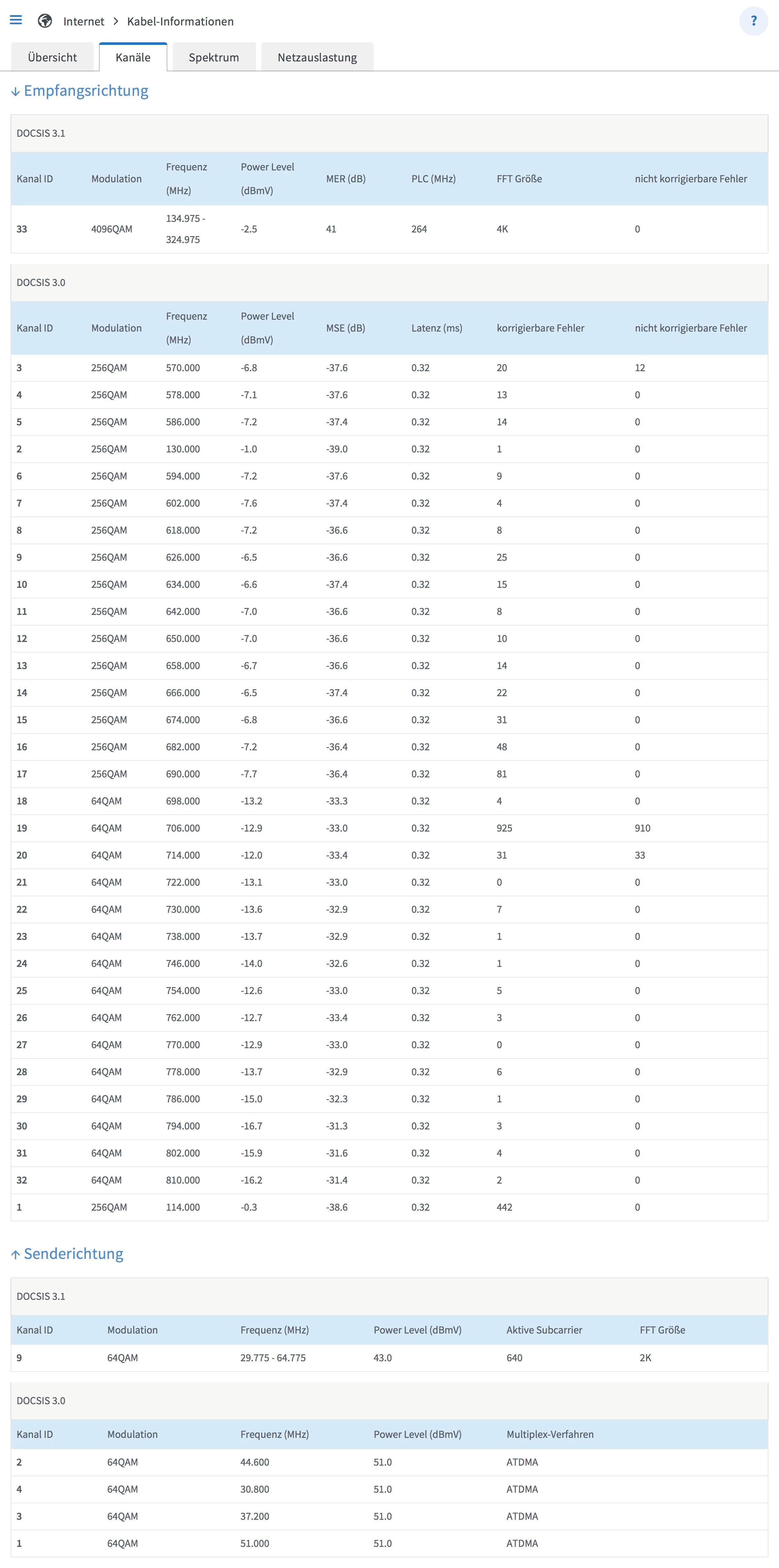 Downstream sollte eigentlich rundum 0 dBmV liegen, und is also _viel_ zu niedrich, zwach.