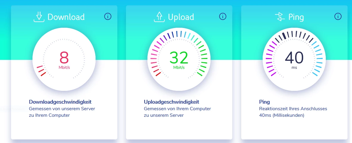 Upload ist super da bekomme ich so meine 27 bis 32 mbit/s rein. Jedoch beim Download nur 7-9 mbit/s und der Ping liegt bei 60 MS.Ich habe eine Fritzbox 7590 und lasse es über das Netztwerkkabel laufen.