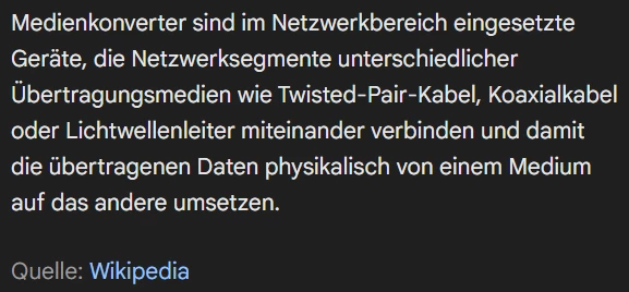 Als ich dann auch mal nach “Medienkonverter” gewikied hatte, war mir klar, dass ich wegen der Mehrdeutigkeit von “Medien” “falsch Abgebogen” war. Hier sind nämlich Übertragungs-Medien gemeint. Ich war in Richtung “TV” und “Film”, dass passt hier nicht ganz.