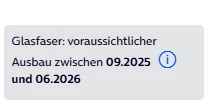 Um das klarzustellen: Die Angabe „Verfügbarkeit“ bedeutet in unserem Fall, dass an deiner Adresse der Ausbau des Glasfaseranschlusses geplant ist und in einem bestimmten Zeitraum – zwischen September 2025 und Juni 2026 – erfolgen wird. Das heißt, die Bestellung ist bereits möglich, aber die tatsächliche Aktivierung des Anschlusses erfolgt erst, wenn der Ausbau abgeschlossen ist. Das wurde im Bestellprozess für deine Adresse angezeigt: