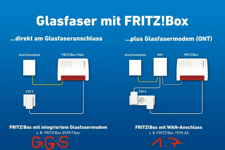 GGS kommt, im Gegensatz zu Glasfaser 1.7, nicht mit einer zwischen geschalteten ONT klar, daher benötigt man eine passende FRITZ!Box mit integrierter ONT zB 5530 oder 5590.
