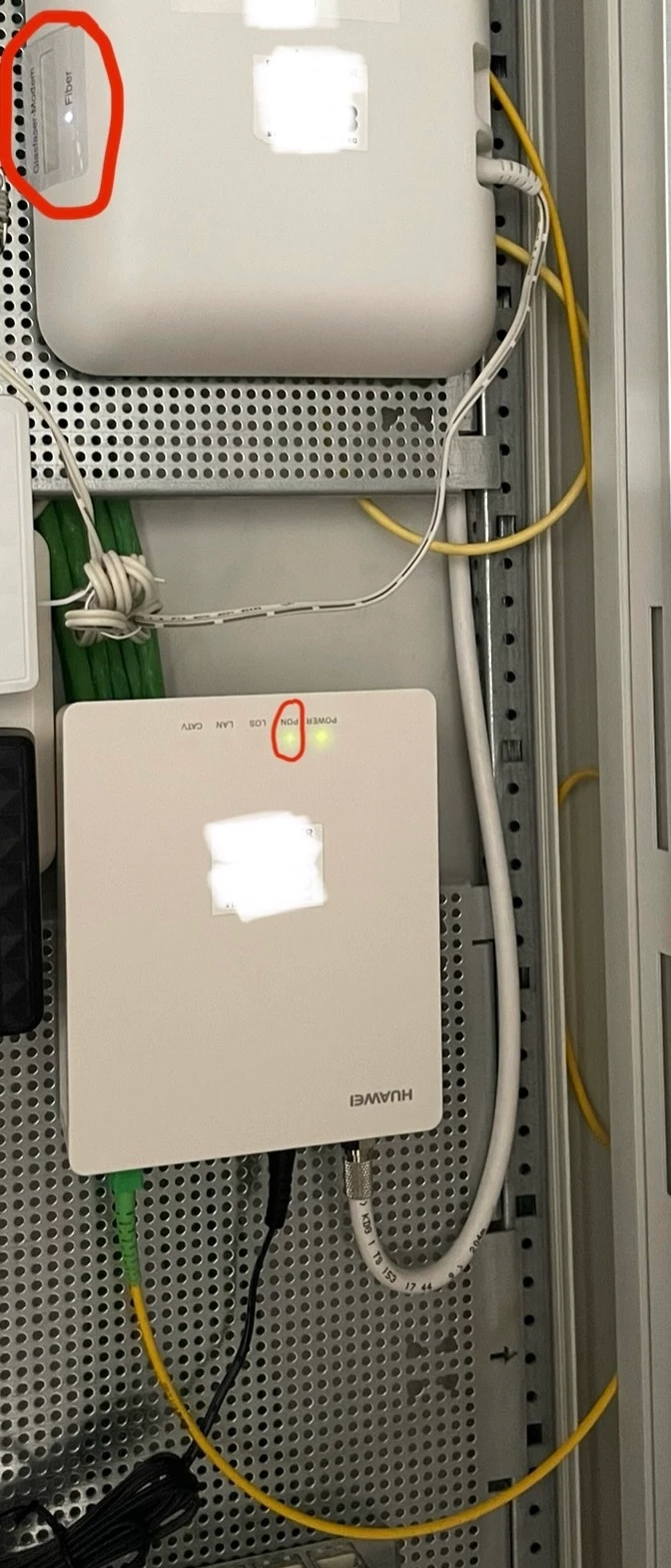 Das etwas dunklere gelbe Kabel verbindet die alte ONT (HUAWEI) mit dem alten Glasfasermodem.