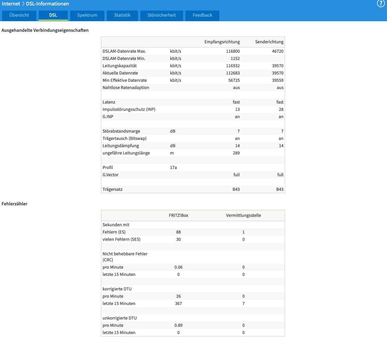 die Fehler liegen bei dir nur auf der Empfangsseite. Wenn es ein Leitungsfehler wäre müßte sich dieser auch auf der Sendeseite Richtung Vermittlungsstelle bemerkbar machen.