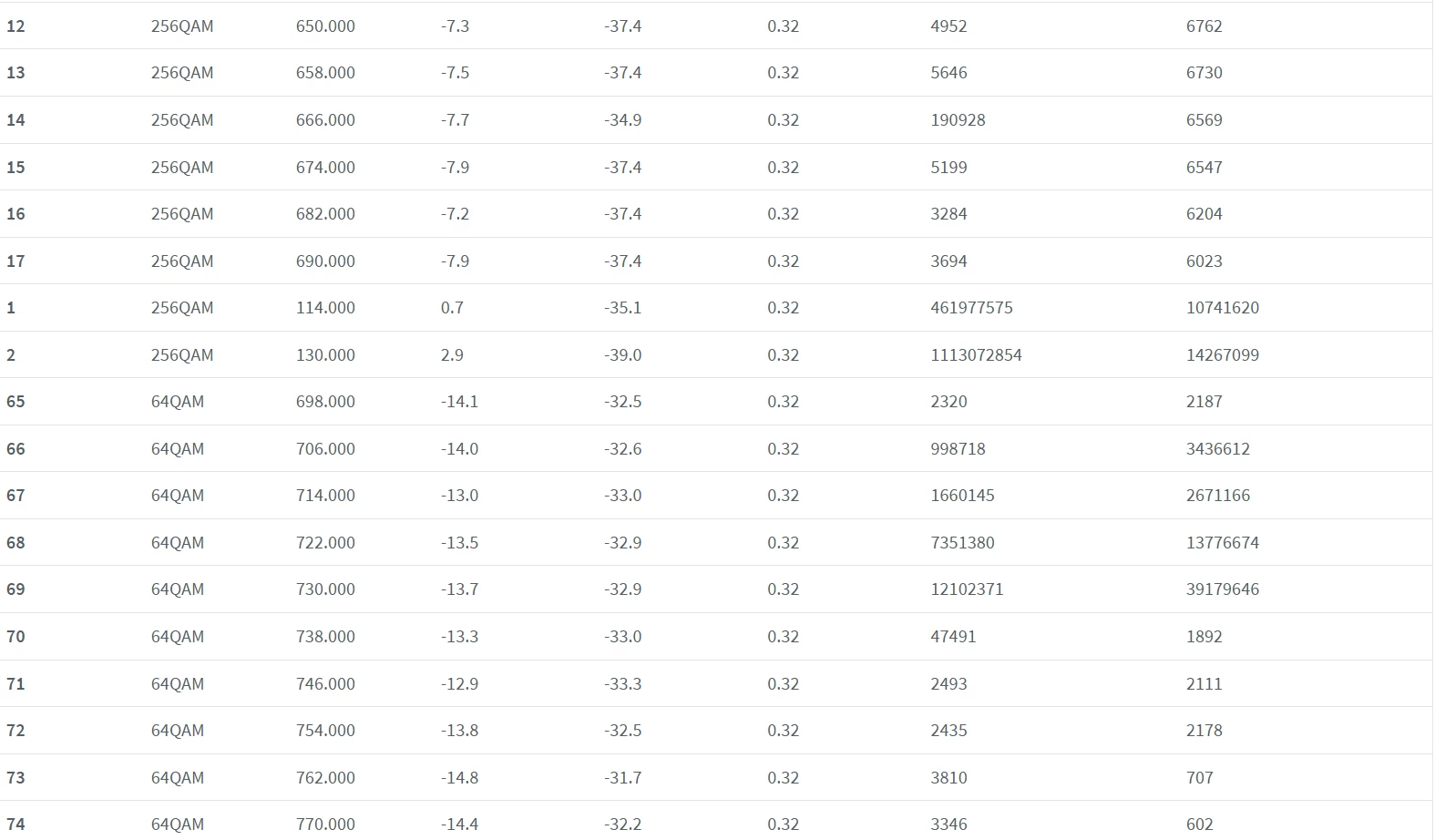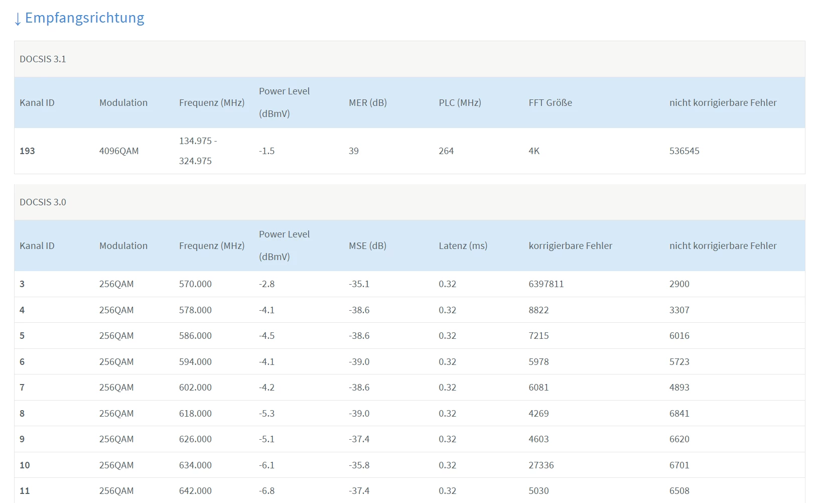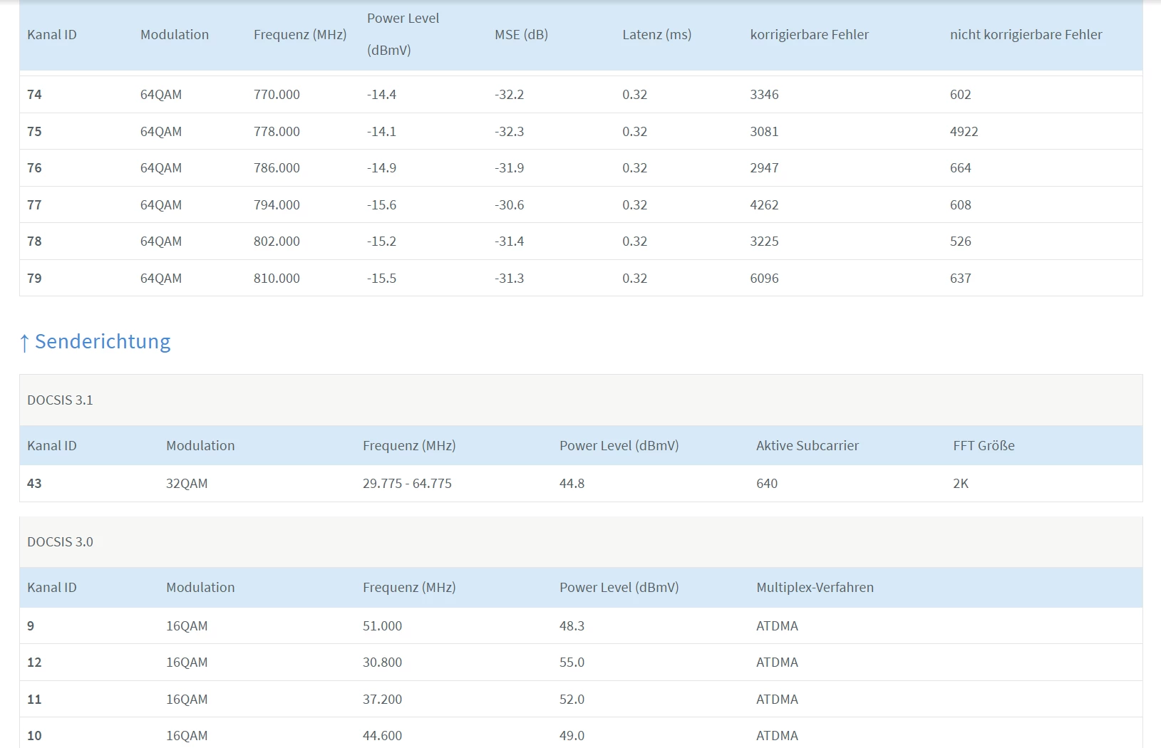 Aber die Senerichtung ist massiv gestoert. Fuer DOCSIS3.1 ist das Ziel 4096QAM (bei manchen Segmenten auch b is runtter auf 256QAM, 32QAM ist komplett inakzeptabel), Bei DOCSIS3.0 ist das Ziel 64QAM, 16QAM ist ein Zeichen fuer eine massive Stoerung im Segment.