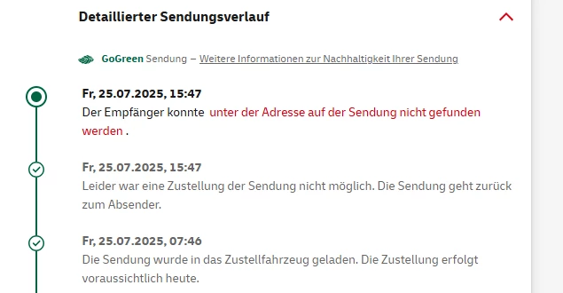 Sie sagten, ich solle mir schreiben, wenn der Router ankommt. Aber der DHL-Postdienst konnte seine Aufgabe seit zwei Wochen nicht erfüllen. Ich bin ein normaler Mensch, der seine Wohnadresse kennt. Von Mittwoch bis heute war die Zustellung auf jeden Tag eingestellt: von Dienstag, dem 22.07.2025, bis Freitag, dem 25.07.2025. Heute, Freitag, den 25.07.2025, kam die Nachricht, dass das Paket zwischen 9.30 und 11.00 Uhr zugestellt würde. In dieser Zeit kam ein Auto mit Post an. Ich ging auf das Mädchen zu und fragte nach dem Paket. Die Mitarbeiterin sagte mir, dass sie das Paket nicht habe. Und wieder gibt es den Status „Zurück an Absender“ wegen „Adresse nicht gefunden“. Ich möchte den Router und das Internet erhalten, wofür ich jeden Monat die Rechnung bezahle. Es scheint, dass der Lieferdienst überhaupt nicht funktioniert.
