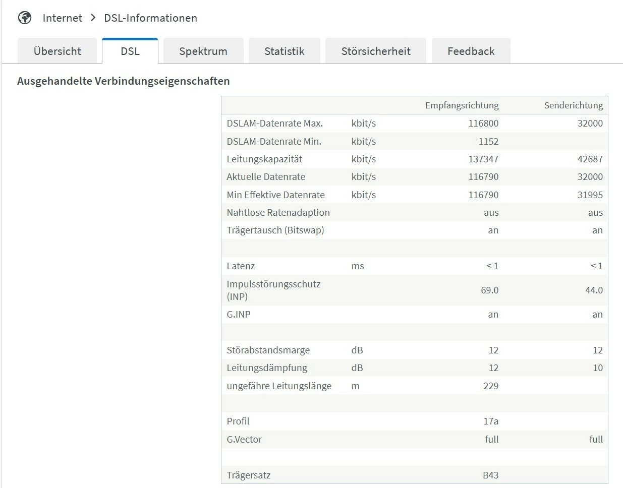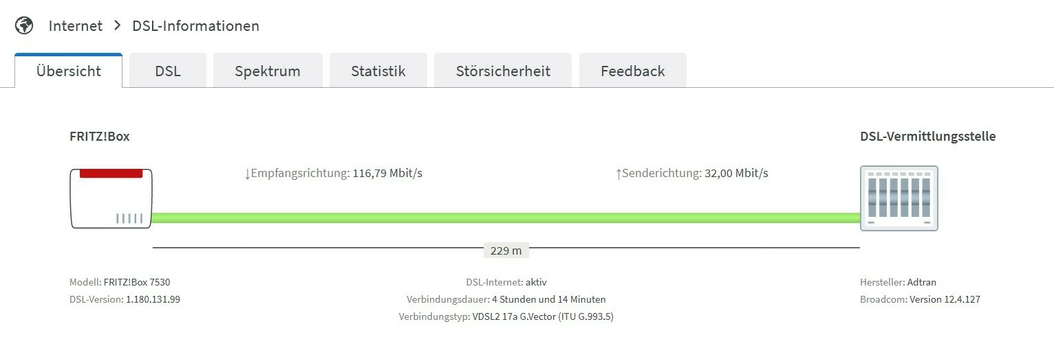 Die Fritzbox zeiogt mir Geschwindigkeit: ↓ 114,1 Mbit/s ↑ 36,1 Mbit/s an.