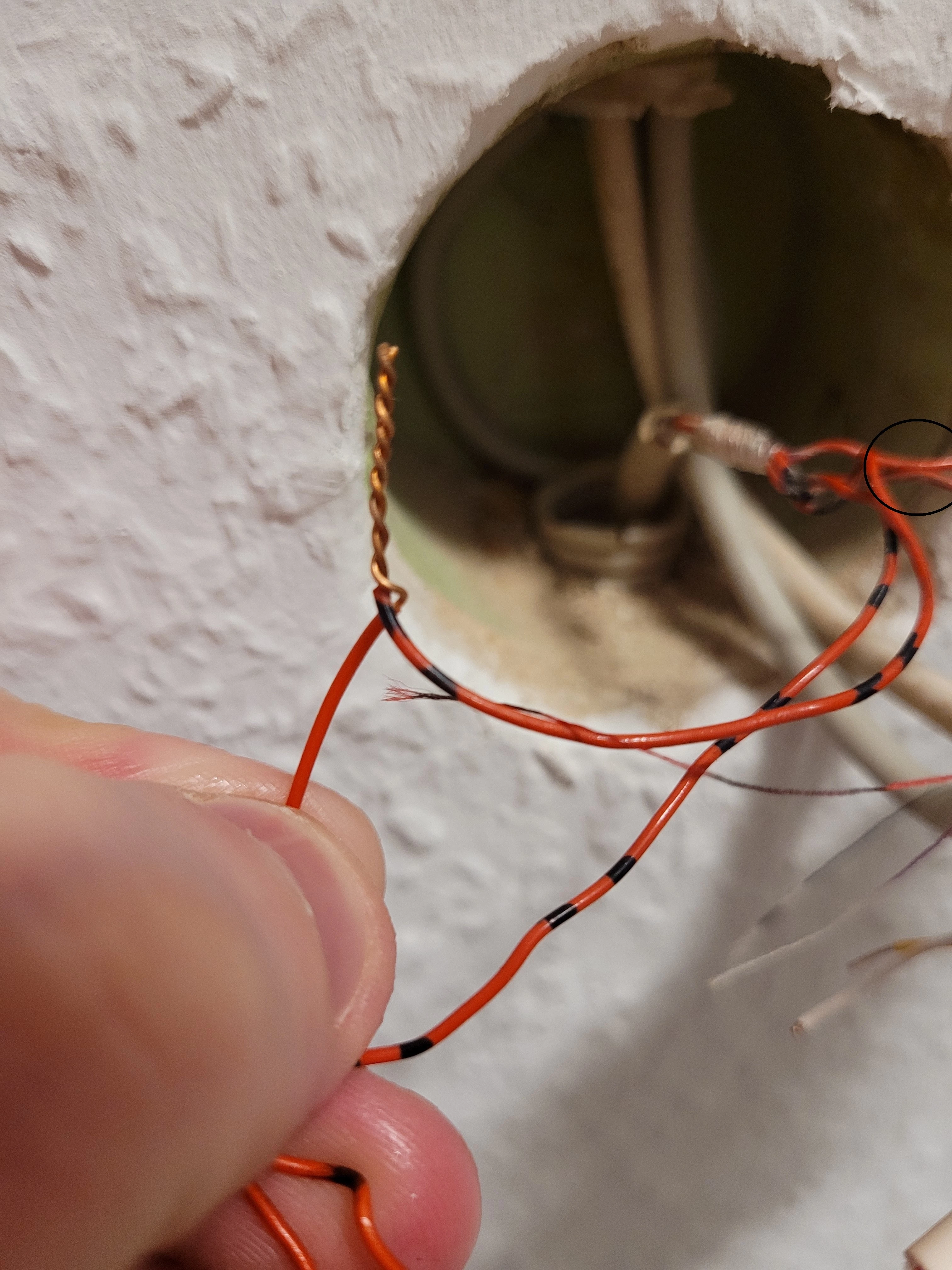 Sofern ich bis nach unten komme, das Leerrohr ist sehr schmal. was mich eh wundert ist dieser kack hier, was ist das?! Das is eine Ader von unten quasi APL und einmal nach oben weg. Ich hoffe ja nicht vom Mieter über mir...