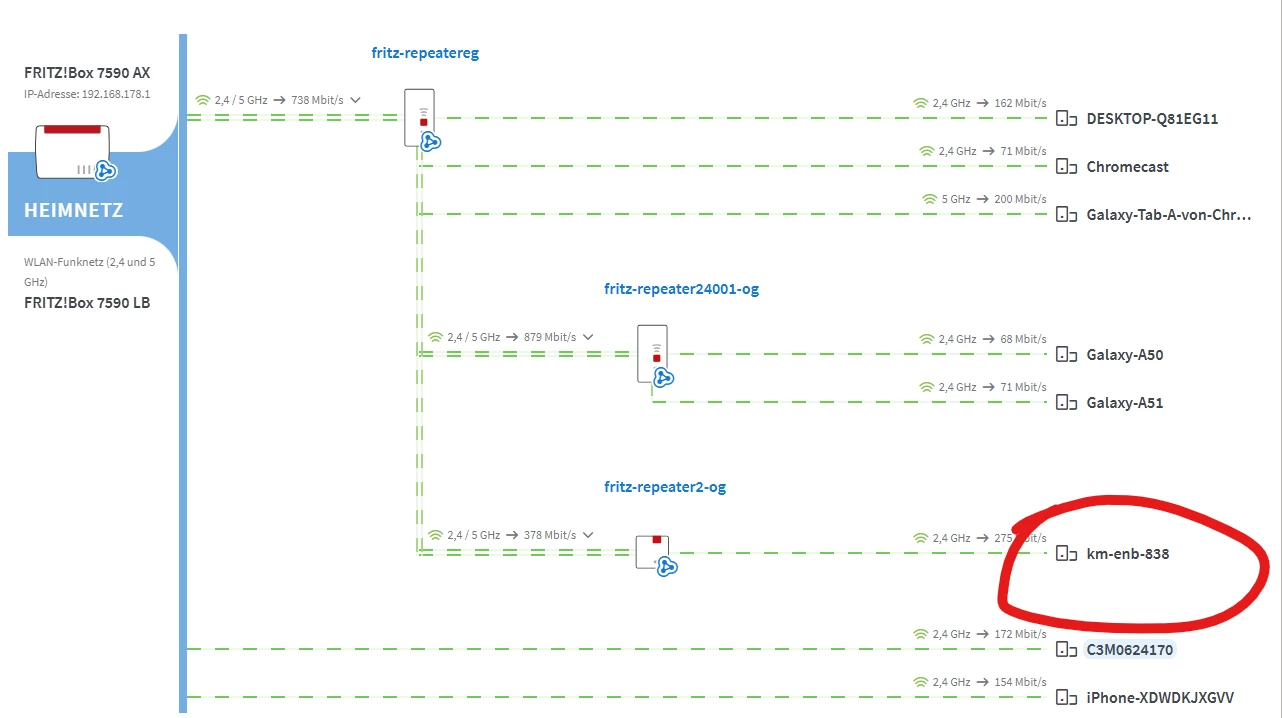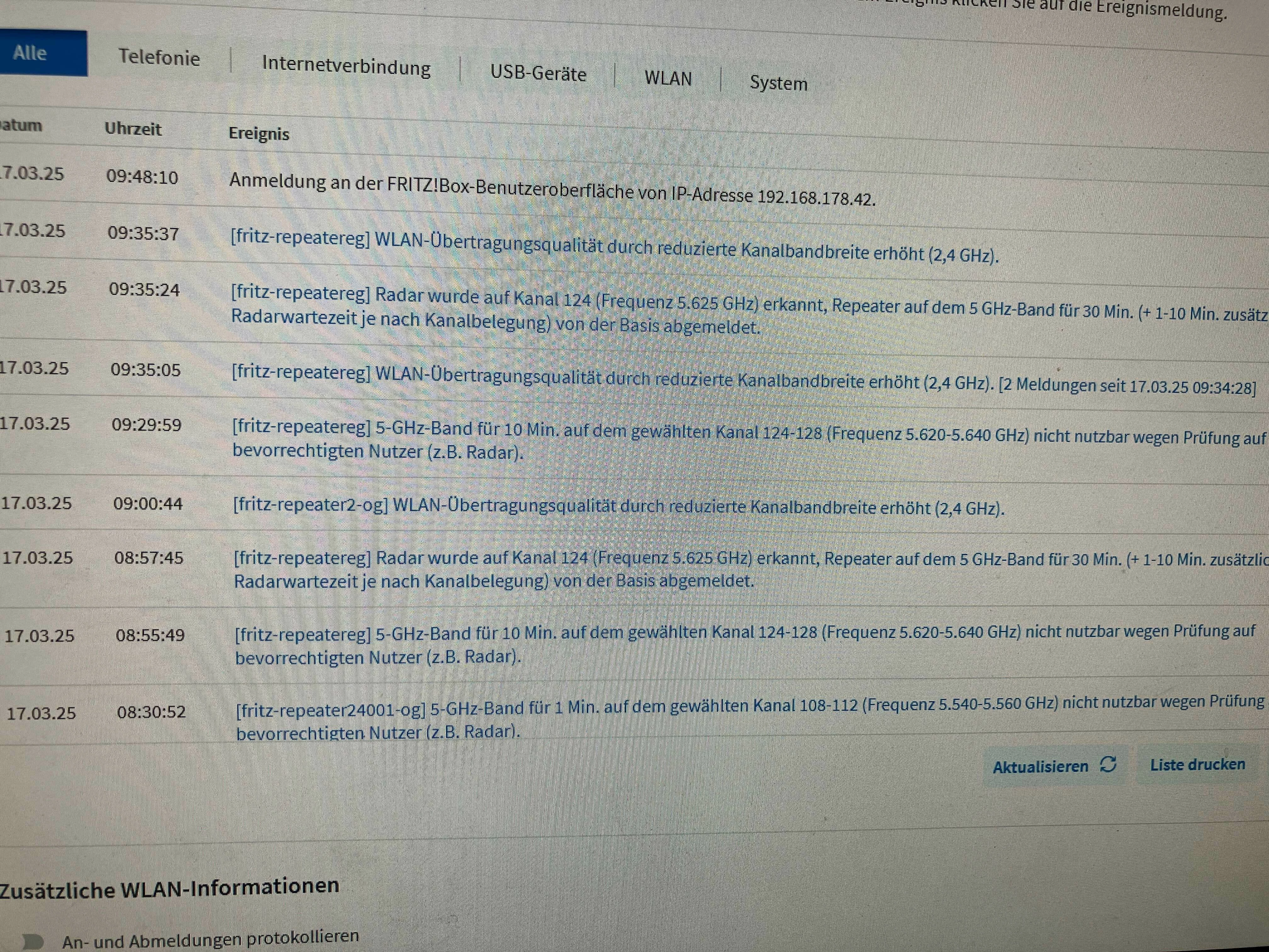 Im Anhang findet ihr das Fehler-Protokoll der Fritzbox, aber auch einen Screenshot meines Meshs. Der rot eingekreiste Rechner hat die meisten Probleme. Dort haben wir die gravierendsten Internetprobleme. Teilweise keine Video-Calls oder IT-Anrufe möglich.