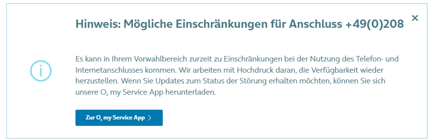 Wenn dir auf Mein o2 bereits angezeigt wird, dass es zu Einschränkungen an deinem Anschluss kommen kann, liegt eine Großstörung vor. In der Regel werden diese schnell vom jeweils zuständigen Kabelnetzbetreiber behoben.