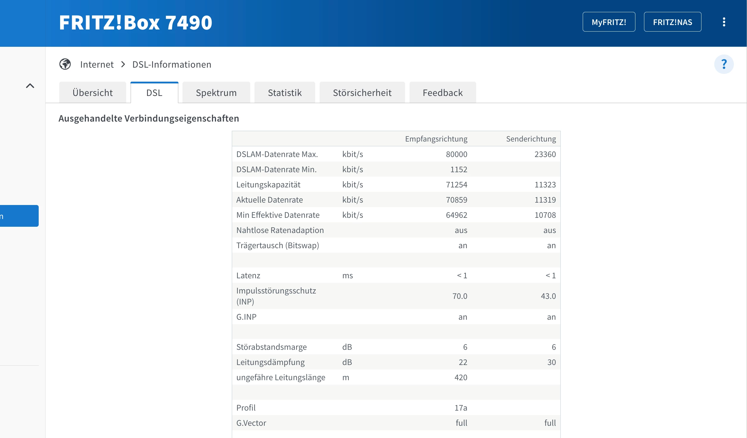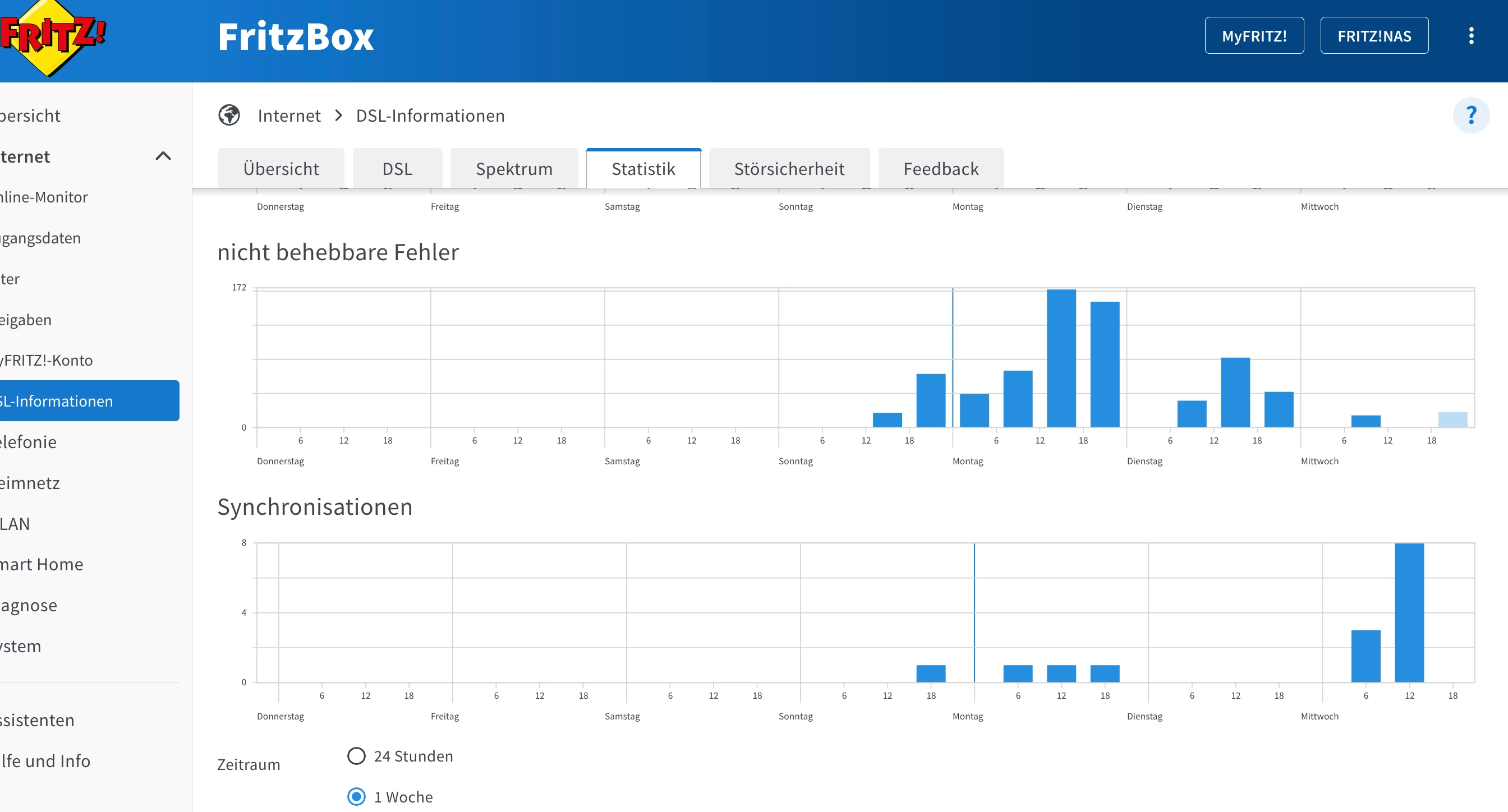 und hier mal die folgenden Seiten als Bild hochladen Übersicht, DSL (alle Daten) Spektrum und Statistik (Woche).