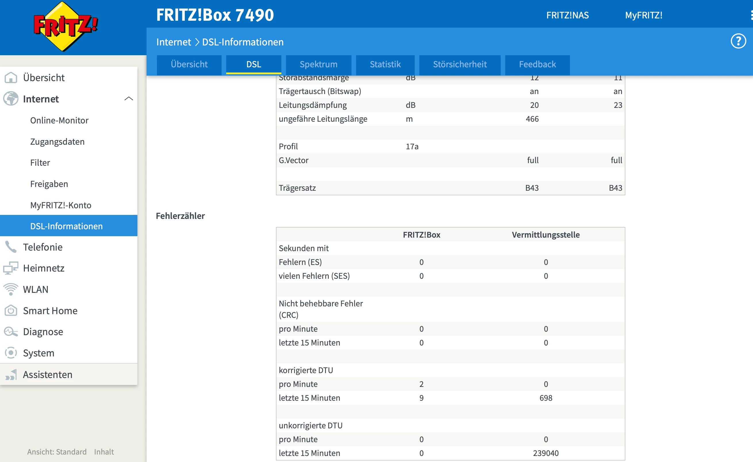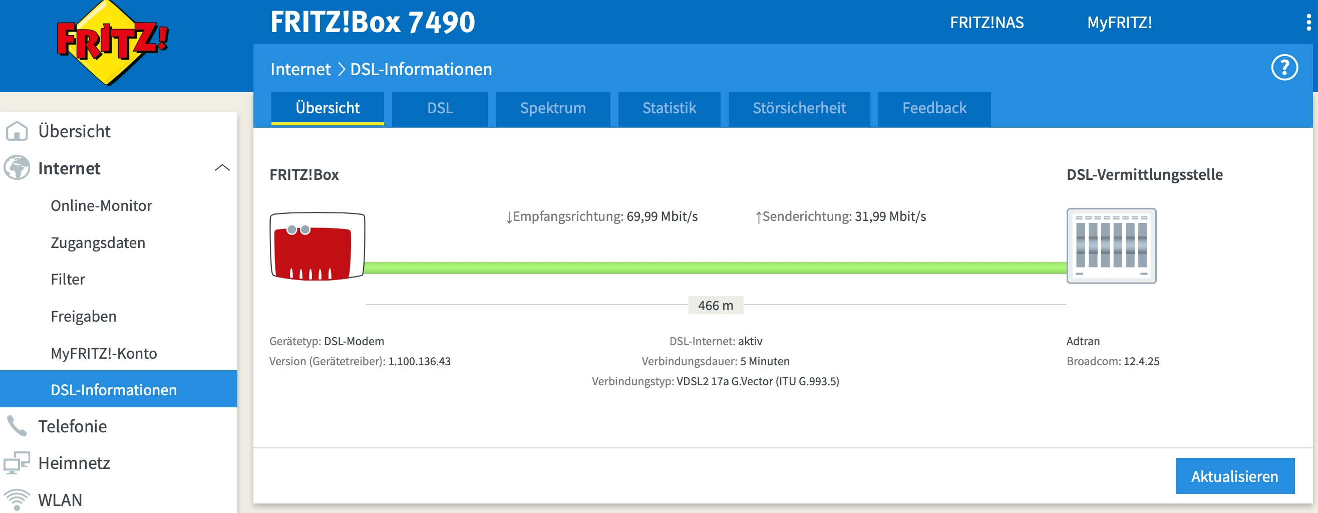 • Laut Fritz!Box steh aber die Verbindung mit 69,99 Mbit/s Up und 31,99Mbit/s Downstream.