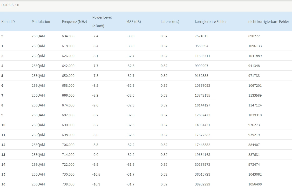 Aber mal was positives 64QAM ist die hoechste Modulationsstufe die bei Docsis 3.0 in Senderichtung im Massenmarkt verwendet wird, das ist zumindest mal kein schlechtes Zeichen…