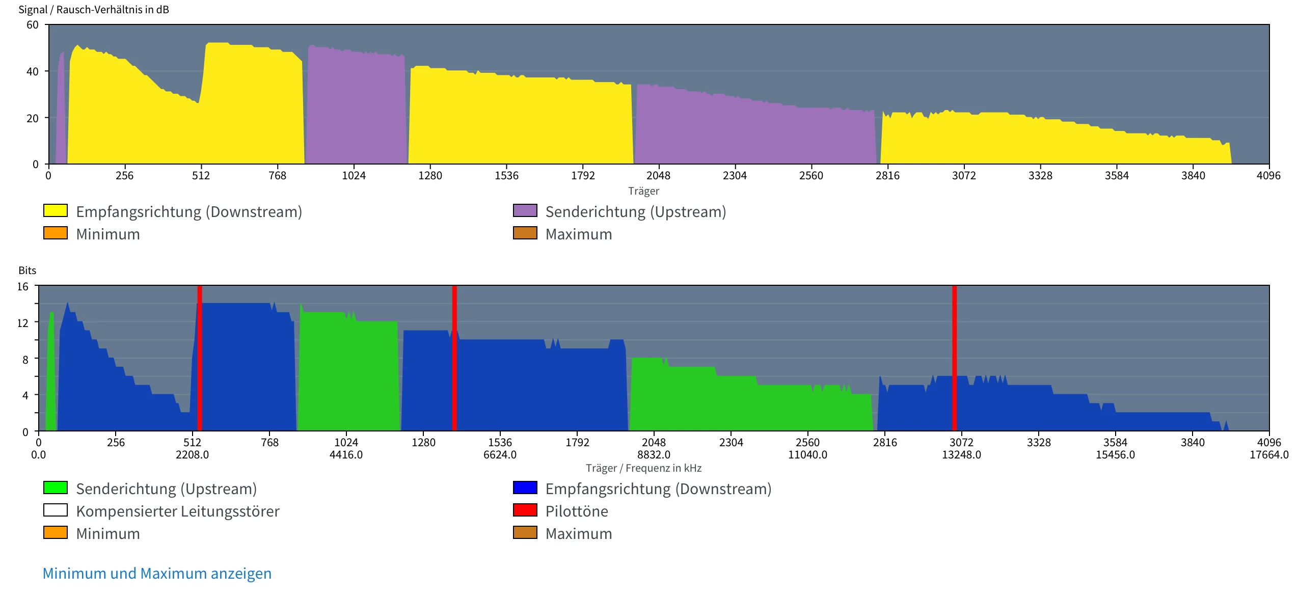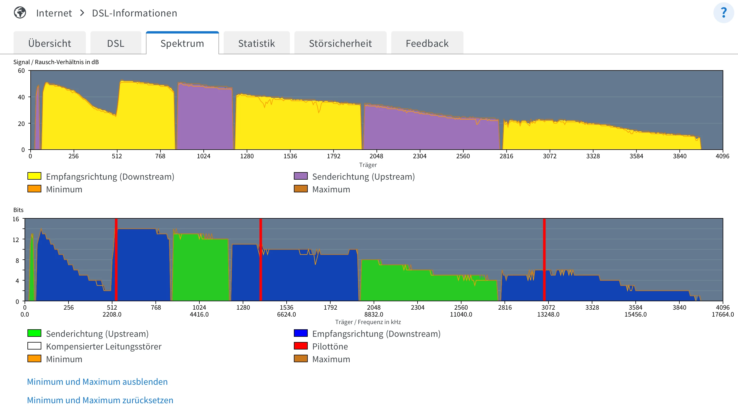 1. ...in der Weboberflaeche der Fritzbox Screenshots von allen Tabs im Bereich Internet->DSL Informationen machen und hier posten wuerdest; beim Spektrum Tab erst den “Maximum und Minimum anzeigen” Link klicken, bei Tabs die sich ueber mehrere Seiten ertrecken, bitte auch mehrere Screenshots anfertigen.