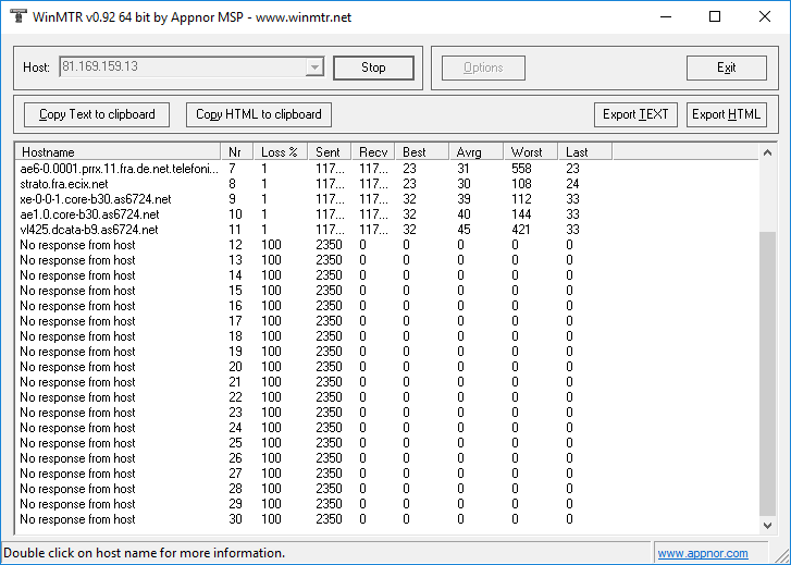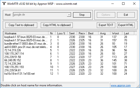 Habe gerade das Programm mitlaufen lassen und https://i.clouds.tf/xrpf/4w69.png  https://i.clouds.tf/64nm/h6pc.png kamen dann da bei raus. Habe es einmal einfach an google machen lassen und einmal an einen Gameserver von einem Kumpel. Kam mehr oder weniger aufs gleiche Ergebnis bei raus auf den ersten Blick (Aber kenne mich da nicht mit aus).