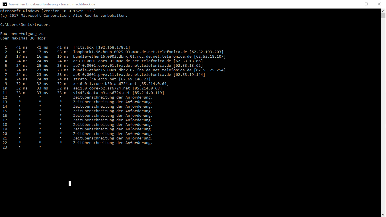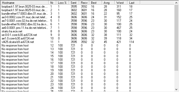 Und hier ein Bild von dem tracert + der einzelnen Hops. Ab 12 halt die Firewall vom Server. Handelt sich um einen Rootserver von einem Kollegen, aber wie gesagt - diese Probeme finden über den ganzen Tag über statt beim Browsen auf alle beliebigen Seiten, sei es google oder faz, ist alles mit dabei. Auch unterschiedlichste Games dabei.