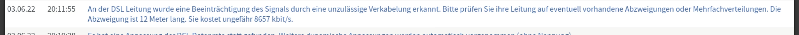 Ich habe regelmäßige Abbrüche und anschließende Neuverbindungen des Internetanschlusses. Das Fehlerprotokoll der FRITZ!Box besagt, dass 12m vom Haus entfernt eine falsche Verkabelung vorliegt. Wie können wir vorgehen um dieses Problem zu beseitigen (etwa der Besuch eines Technikers?) ?