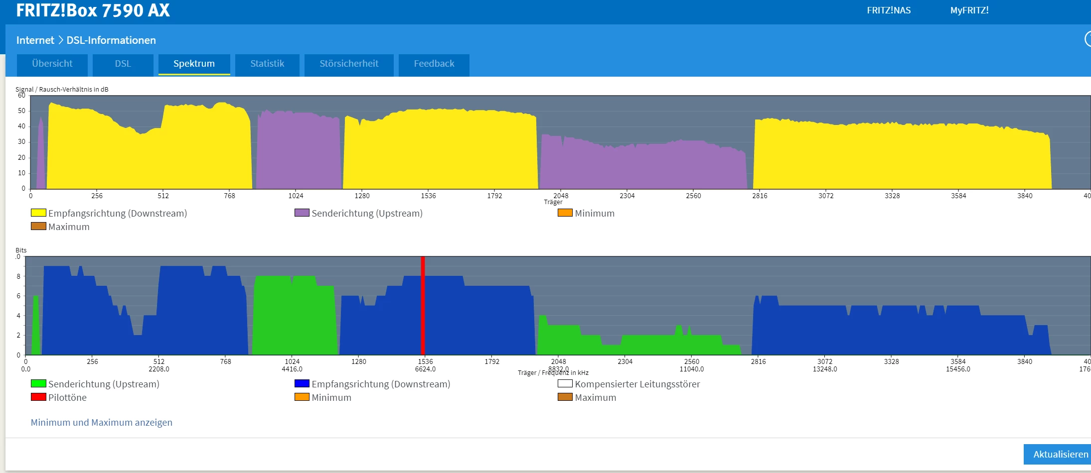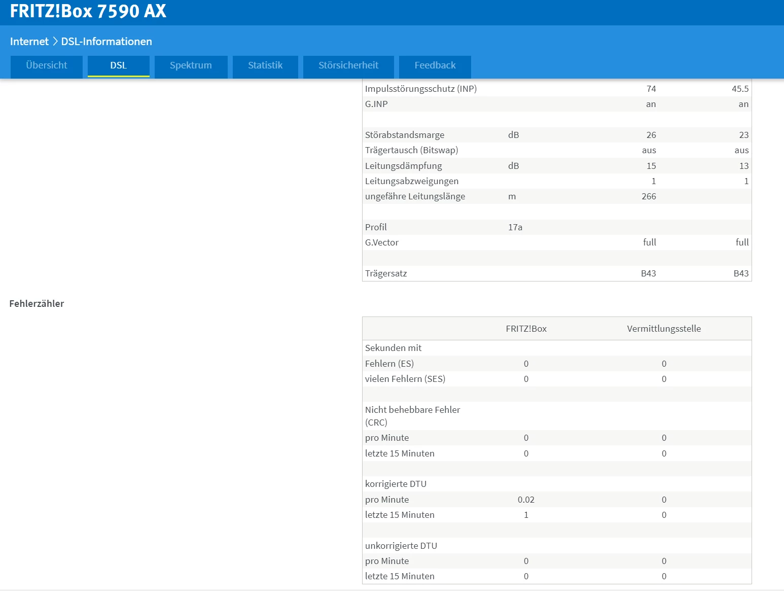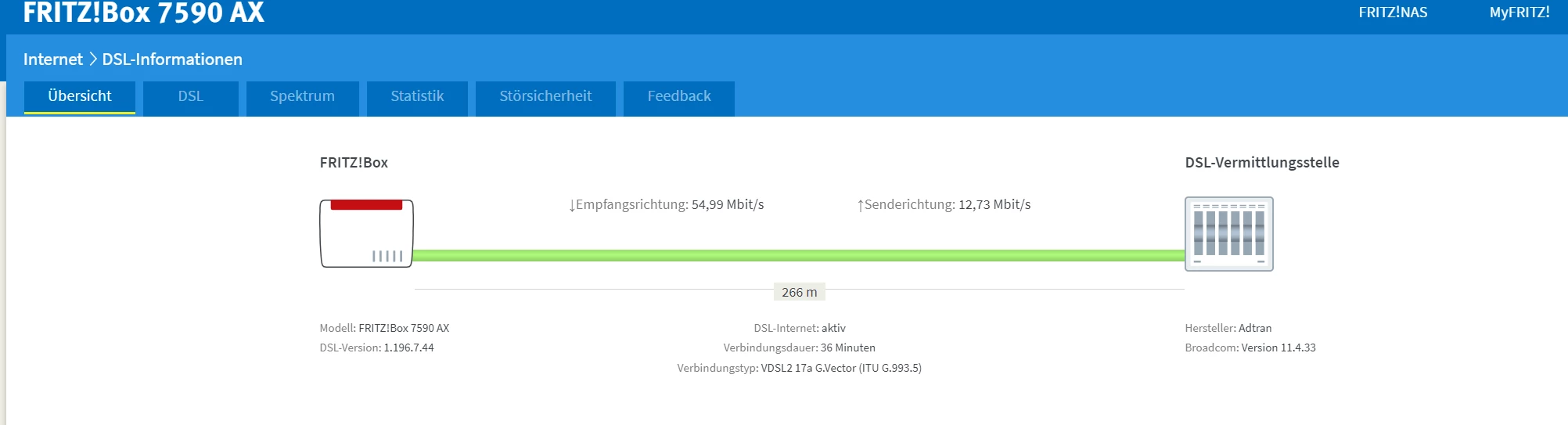 Die Fritzbox zeigt im Menu Internet - DSL Informationen ein Download von 55 Mb/s und Upload 13Mb/s angezeigt, was in Ordnung wäre, da ich einen my Home M Vertrag mit 50Mb/s habe.