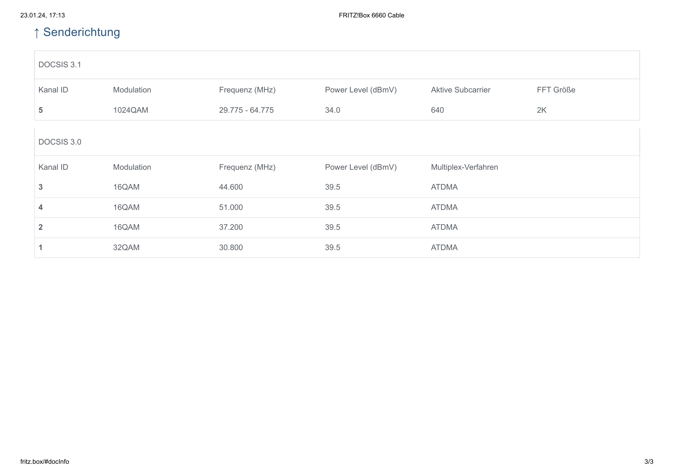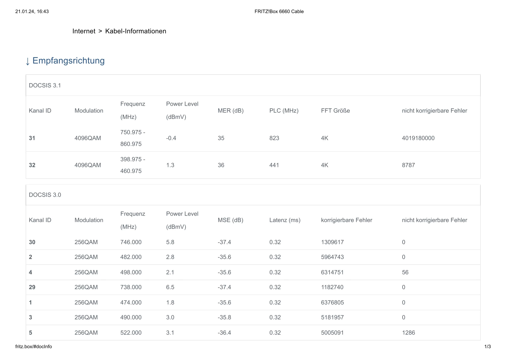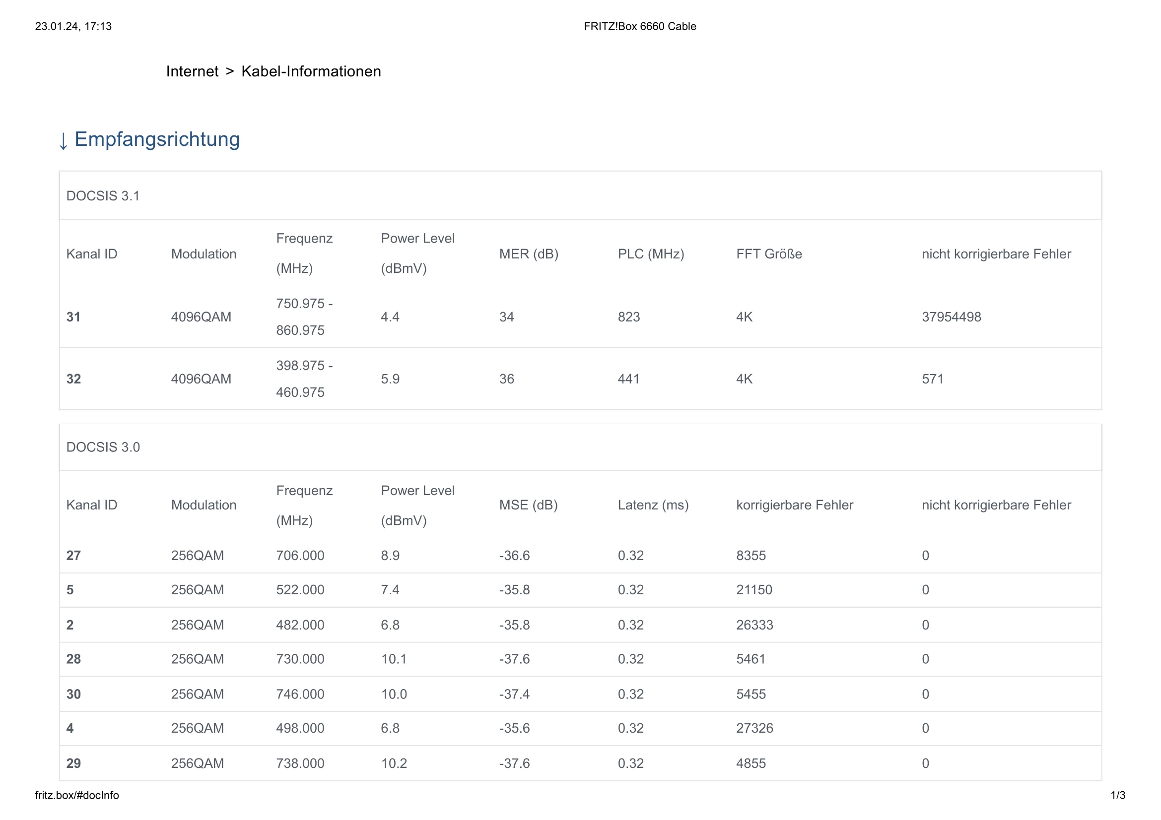 2. Der Upstream ist kaputt, beim DOCSIS 3.1 Upstream sollte es 4096QAM sein (statt 64QAM wie bei Dir) und bei den DOCSIS 3.0 Upstream Kanaelen sollte es  64QAM sein (vielleicht noch 32 QAM) statt der 8QAM.