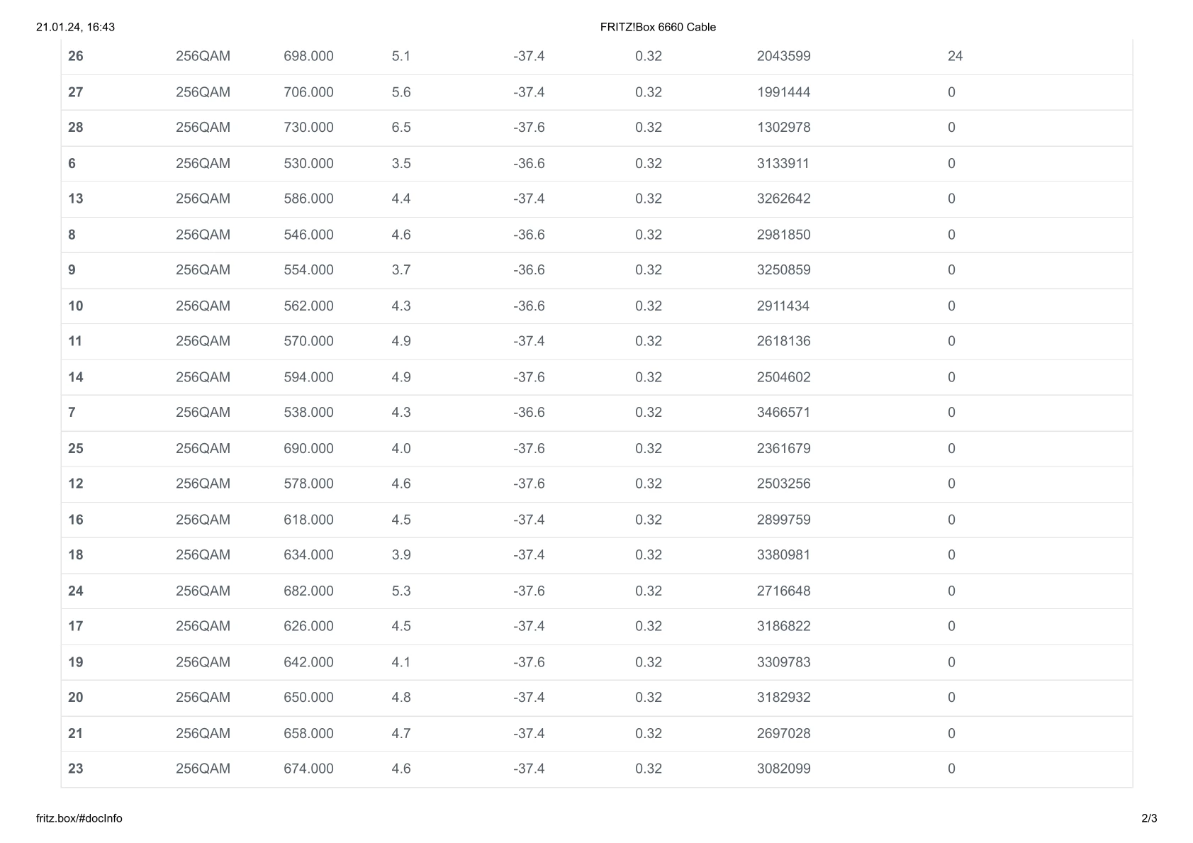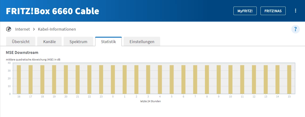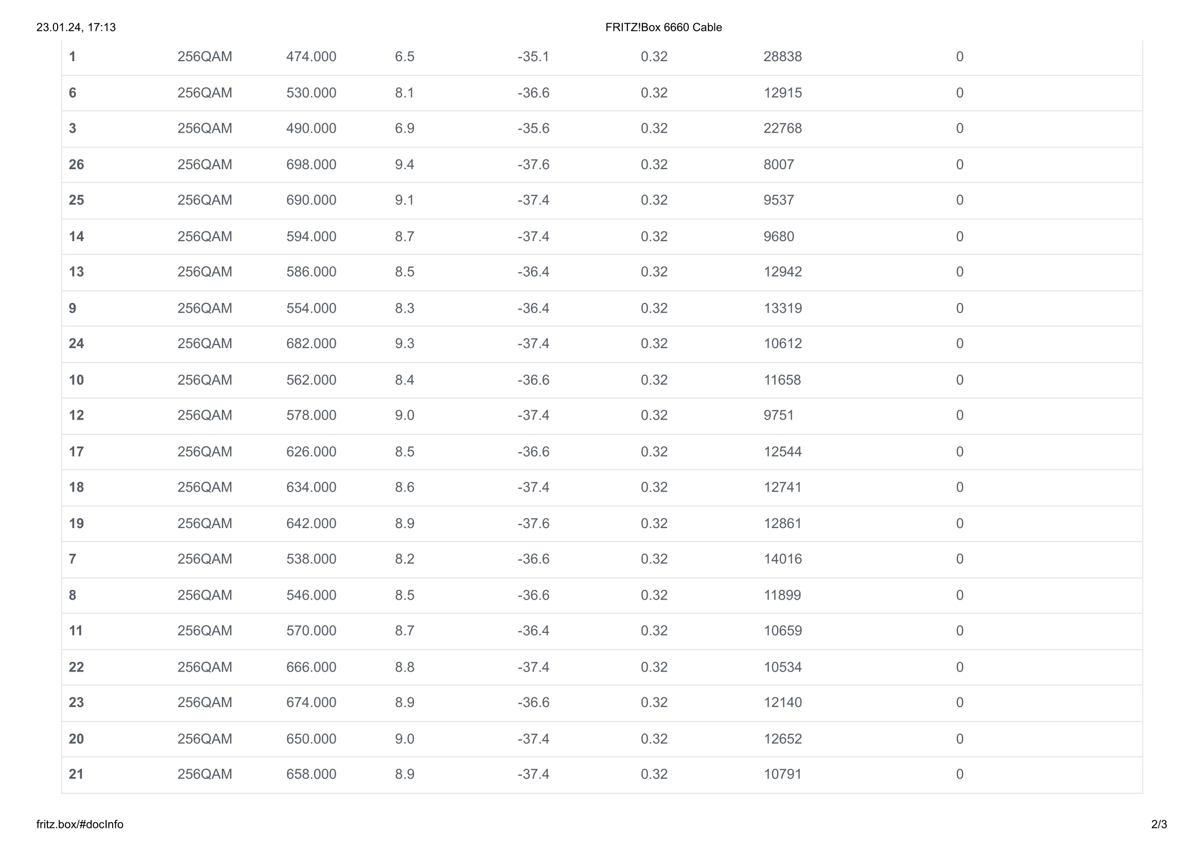 2. Der Upstream ist kaputt, beim DOCSIS 3.1 Upstream sollte es 4096QAM sein (statt 64QAM wie bei Dir) und bei den DOCSIS 3.0 Upstream Kanaelen sollte es  64QAM sein (vielleicht noch 32 QAM) statt der 8QAM.