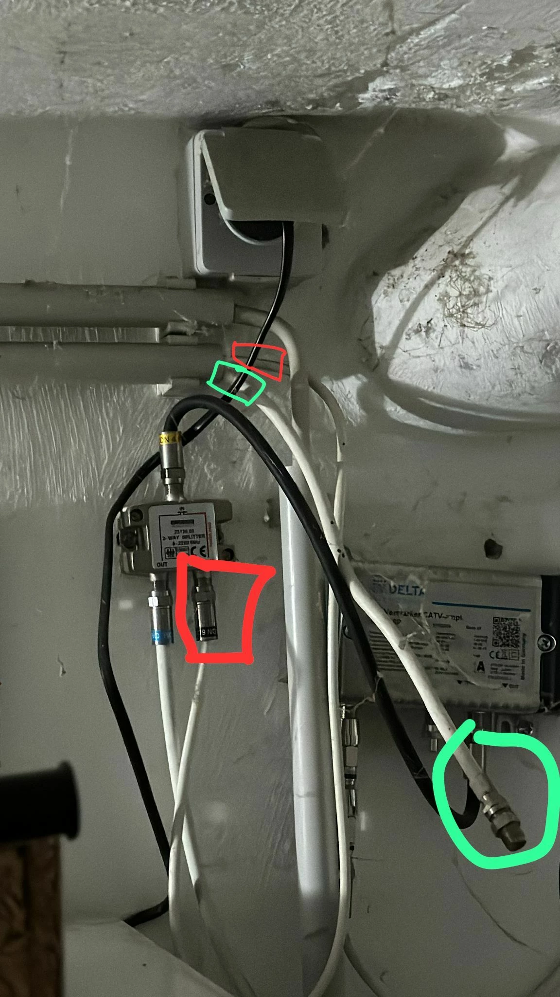 Soweit so gut… Am Ausgang des Gerät hängt ein Splitter mit einem Kabel, das in unser Wohnzimmer führt und einem Kabel das in ein Leerrohr geht. Das Kabel in dem Leerrohr ist nicht alleine sondern teilt sich den Platz mit einem nicht angeschlossenen Kabel. Naja verfolgt man die Kabel, gehen die auf der Tür meines Kellereingangs raus und sind abgeklemmt. Siehe Screenshots. Sprich die Coax Kabel laufen komplett ins leere und meines Erachtens ist der Splitter völlig unsinnig.
