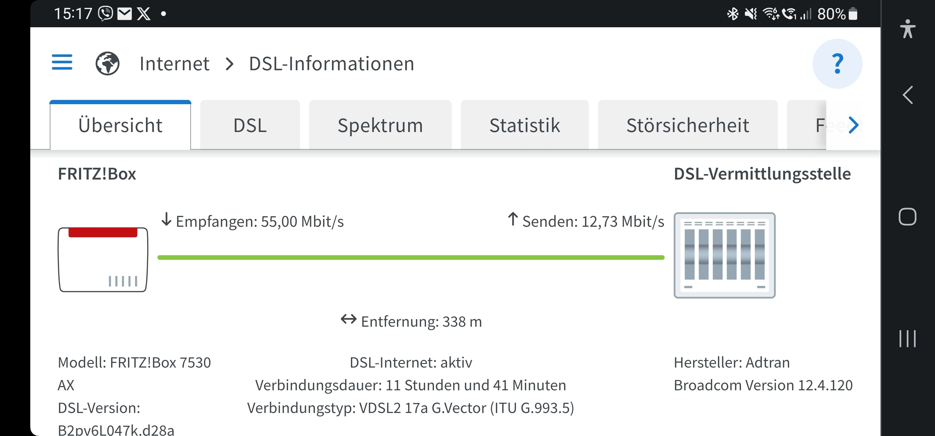 Bei 338m Leitungslänge müßte ein bischen mehr anliegen. Gibt es an deinem Anschluß mehrere TAE-Dosen oder/und werden PLC-Adapter verwendet?