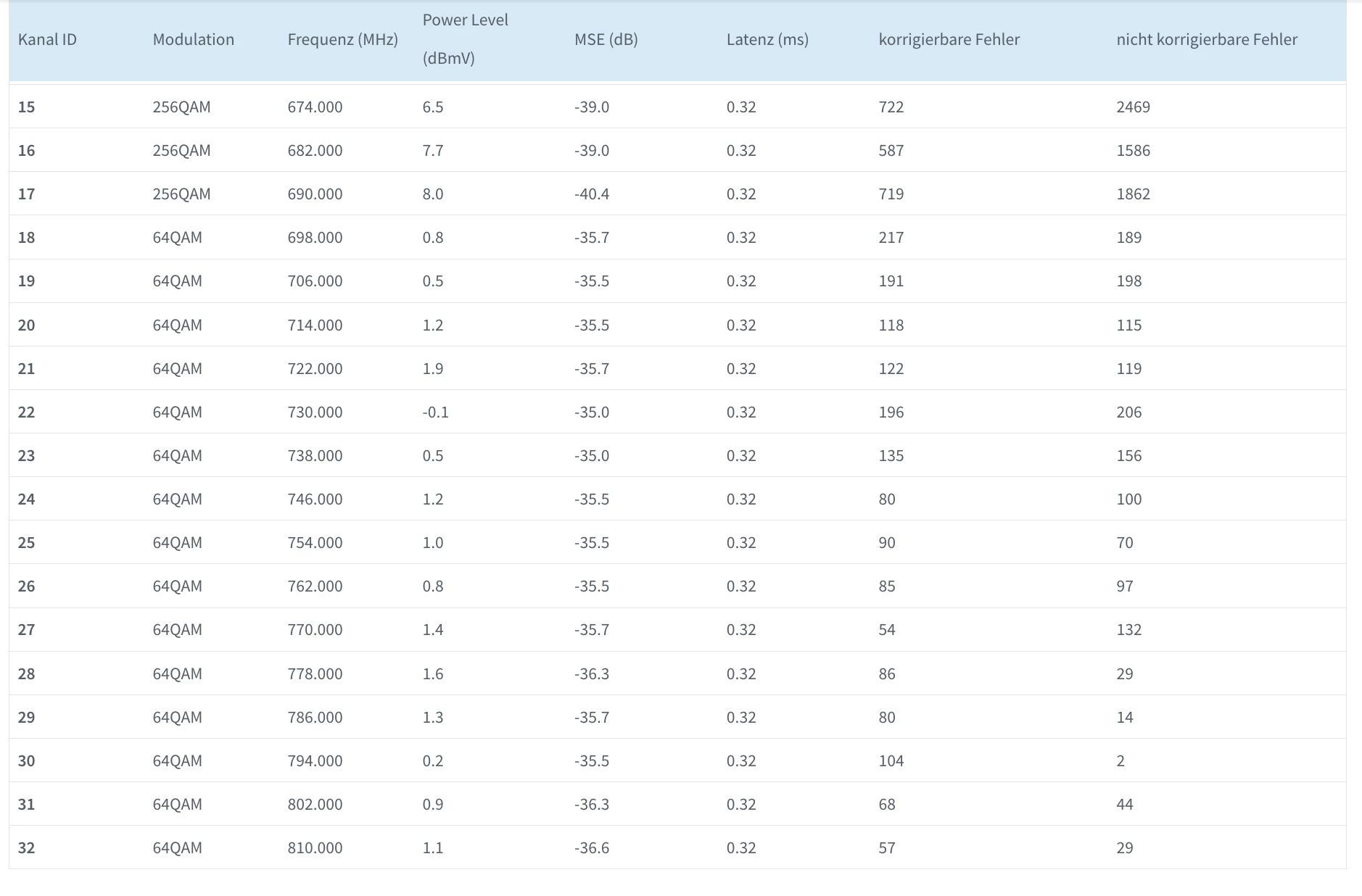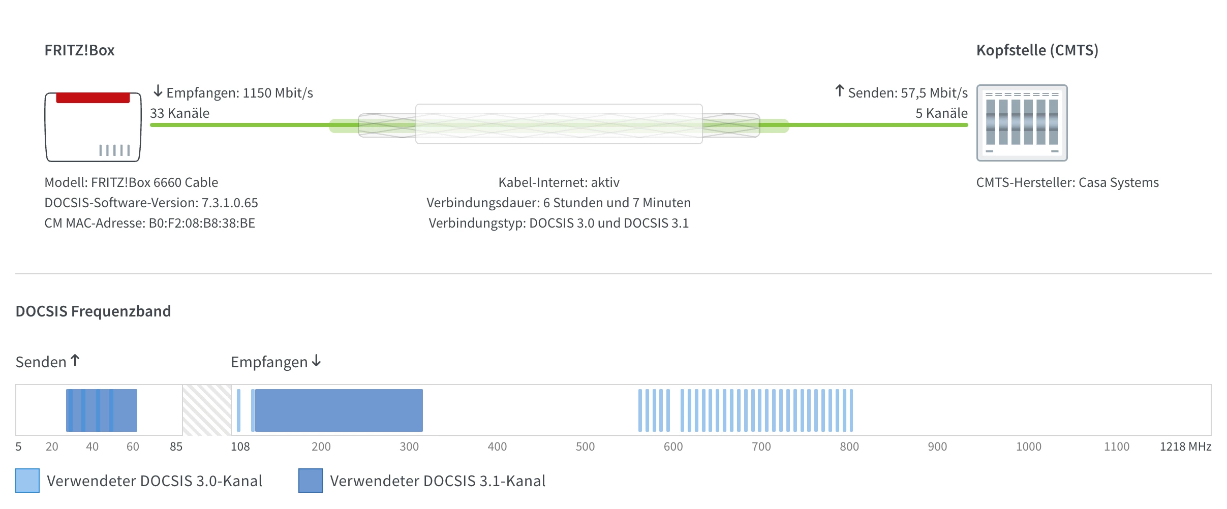 Hervorragend, dann koennen wir versuchen herauszufinden ob Du Probleme auf dem Kabel/Docsis Link hast: