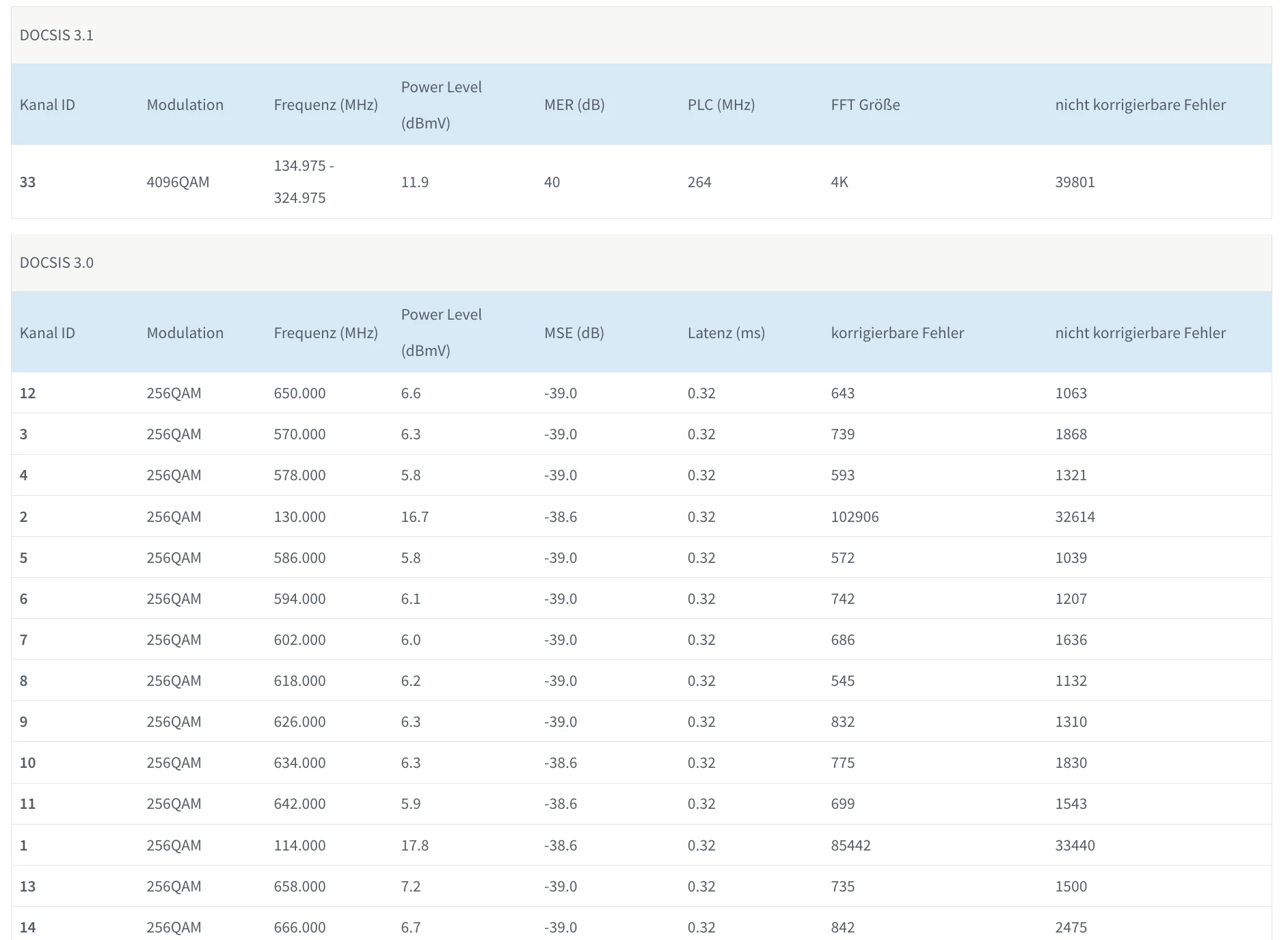 Die nicht korrigierbaren Fehler sind nicht toll (aber auch kein Beinbruch, wenn die nur langsam anwachsen). Die 2456QAM Modulation in der Docsis3.1 Senderichtung sind auch nicht toll, aber das mag fuer Dein Segment normal sein. D.h. auf der Docsis/Kabelseite sieht es nicht so aus, als waere das der Grund fuer Deine Probleme (aber das muss nichts heissen, mach doch bitte nochmal Screenshots der Fritzbox Kanalinformation, wenn Du akut Probleme bemerkst).